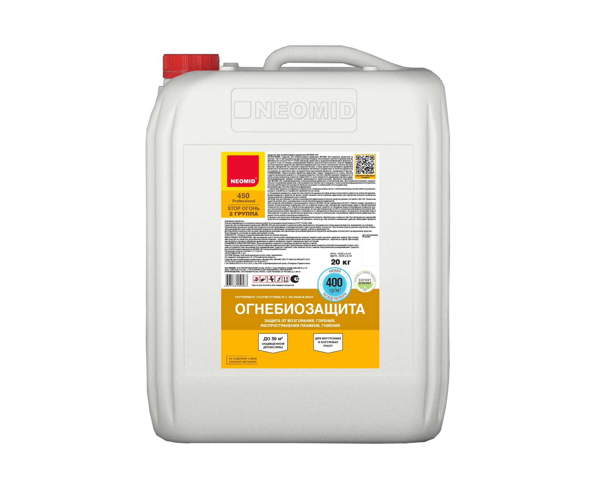 Тонированный - огнебиозащитный состав NEOMID Неомид 450 - 2 группа (20 кг) Н-450(2)-20/тон. защищает древесину на срок до 7 лет от возгорания и распространения пламени, обеспечивая II группу огнезащитной эффективности согласно ГОСТ Р 53292 (переводя древесину в трудновоспламеняемый материал), и на срок 8-10 лет от гниения, возникновения плесени, при отсутствии контакта с влагой. Применяется как защитная пропитка для обработки деревянных стен, балок, стропильных систем, несущих брусьев, перекрытий, лаг, оконных и дверных блоков, а также других конструкций из древесины различного назначения.