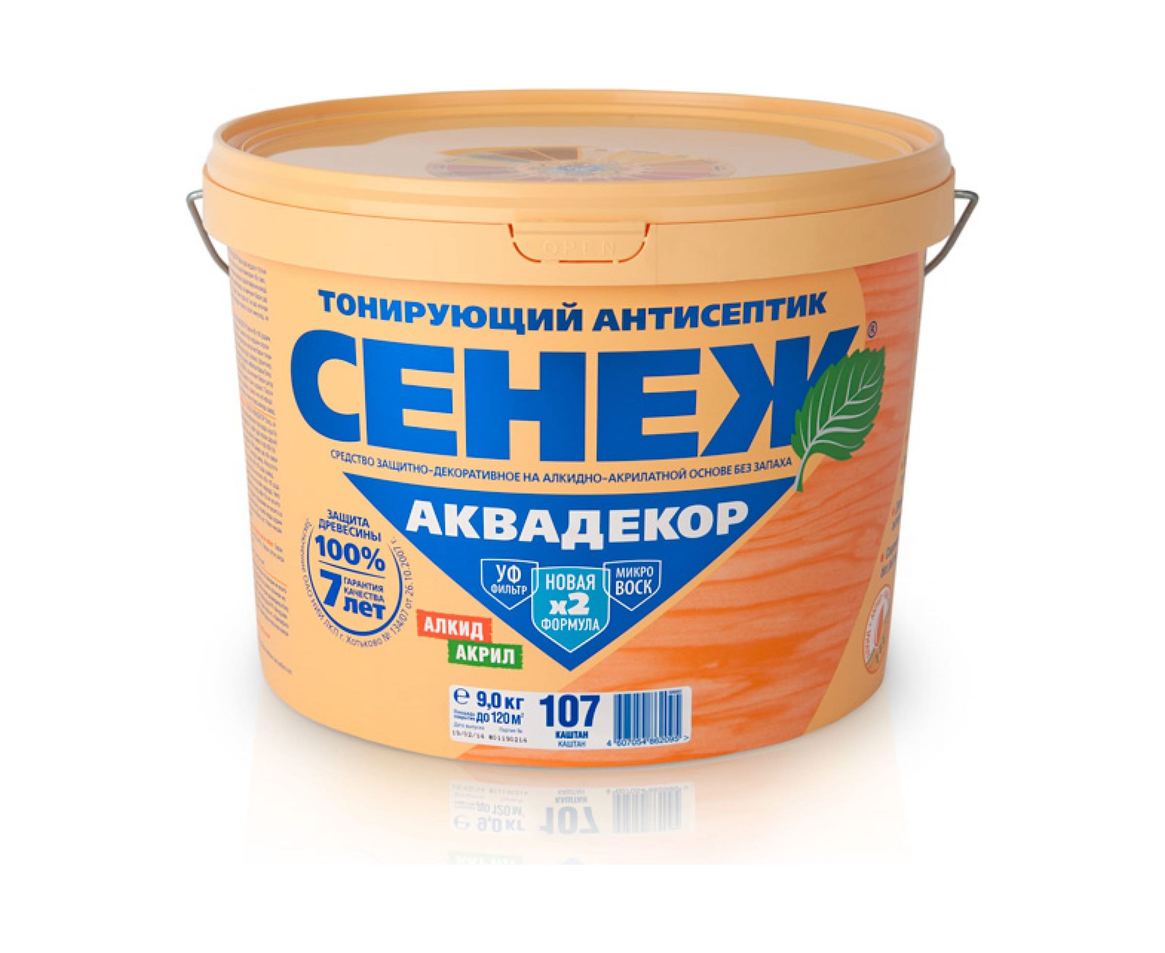 Антисептик для дерева СЕНЕЖ АКВАДЕКОР Х2-107 каштан, 9 кг 11054 предназначен для долговременной защиты древесины от атмосферных осадков, плесневых, деревоокрашивающих и дереворазрушающих грибов, водорослей и насекомых-древоточцев, а также декоративной отделки под ценные породы.