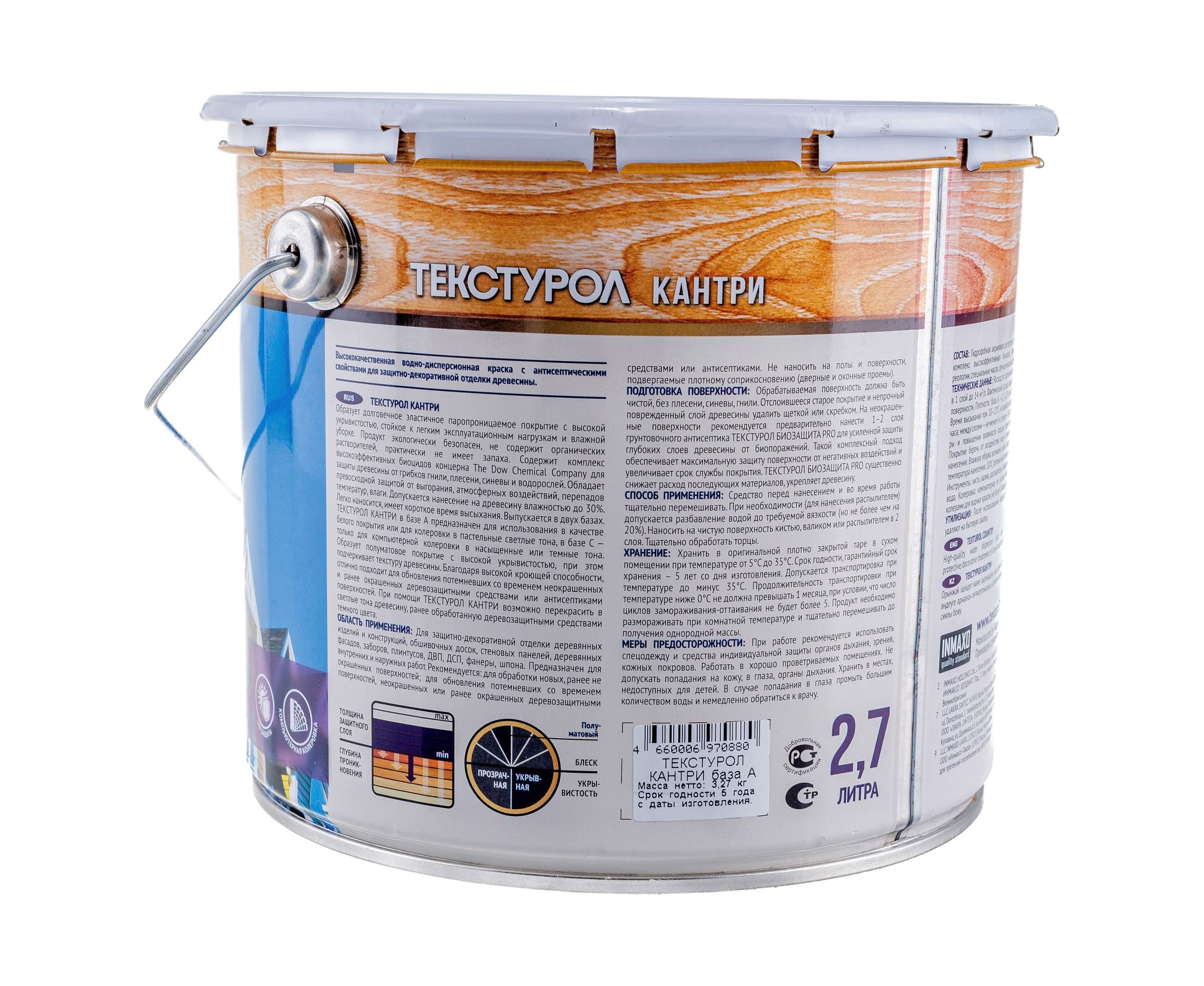 Антисептик Текстурол КАНТРИ база А, белый, 2.7л 90003591491 предназначен для защитно-декоративной обработки деревянных поверхностей внутри и снаружи помещений (элементы интерьера, фасады зданий, обшивочные доски, стеновые панели, заборы, ограждения, плинтус).