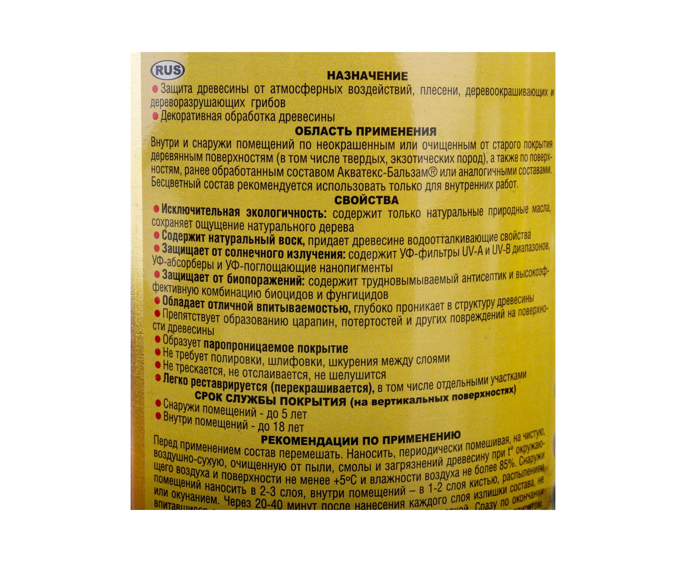 Входящие в состав биоцидные компоненты обеспечивают эффективную защиту от гниения, возникновения плесени, грибка и синевы. Продукт после высыхания образует декоративное покрытие, устойчивое к неблагоприятным атмосферным воздействиям и ультрафиолету.