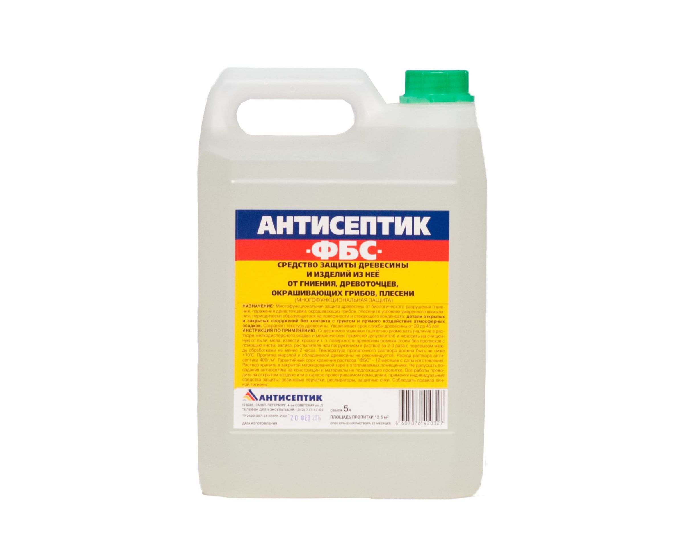 Антисептик «ФБС» водорастворимый, 3-х компонентный биозащитный состав. Без запаха, обладает высокой токсичностью по отношению к дереворазрушающим грибам, древесину не окрашивает, относится к средствам с низкой коррозионной агрессивностью по отношению к черным металлам, пропитанная древесина легко склеивается и окрашивается. Защищенная биозащитным препаратом «ФБС» древесина приобретает стойкость к воздействию биологических агентов ее разрушения (бактерий, грибов, насекомых). Пропитка деревянных конструкций антисептиком «ФБС» увеличивает срок службы древесины от 20 до 45 лет в зависимости от поглощения (удержания) антисептика древесиной и условий ее эксплуатации.