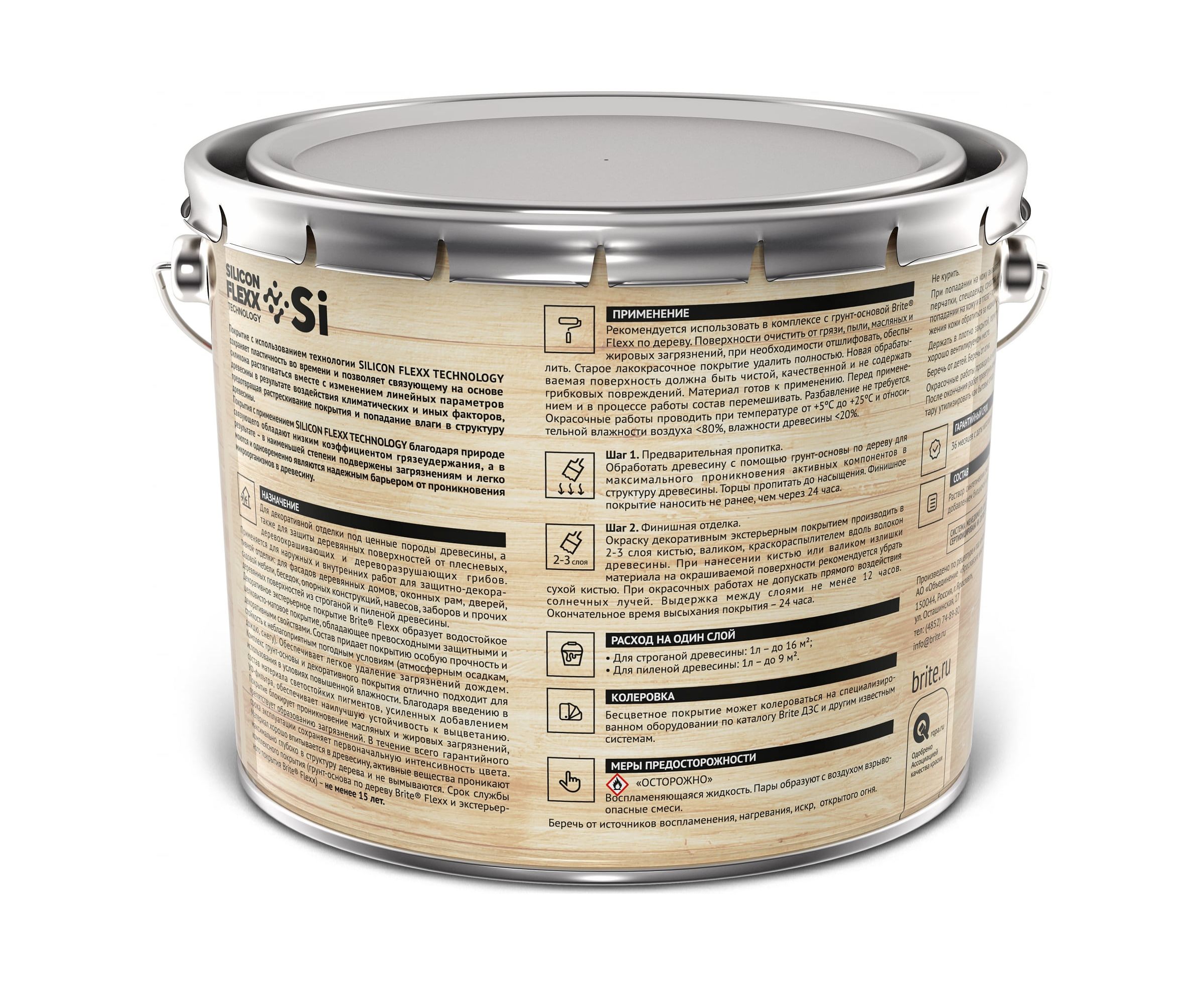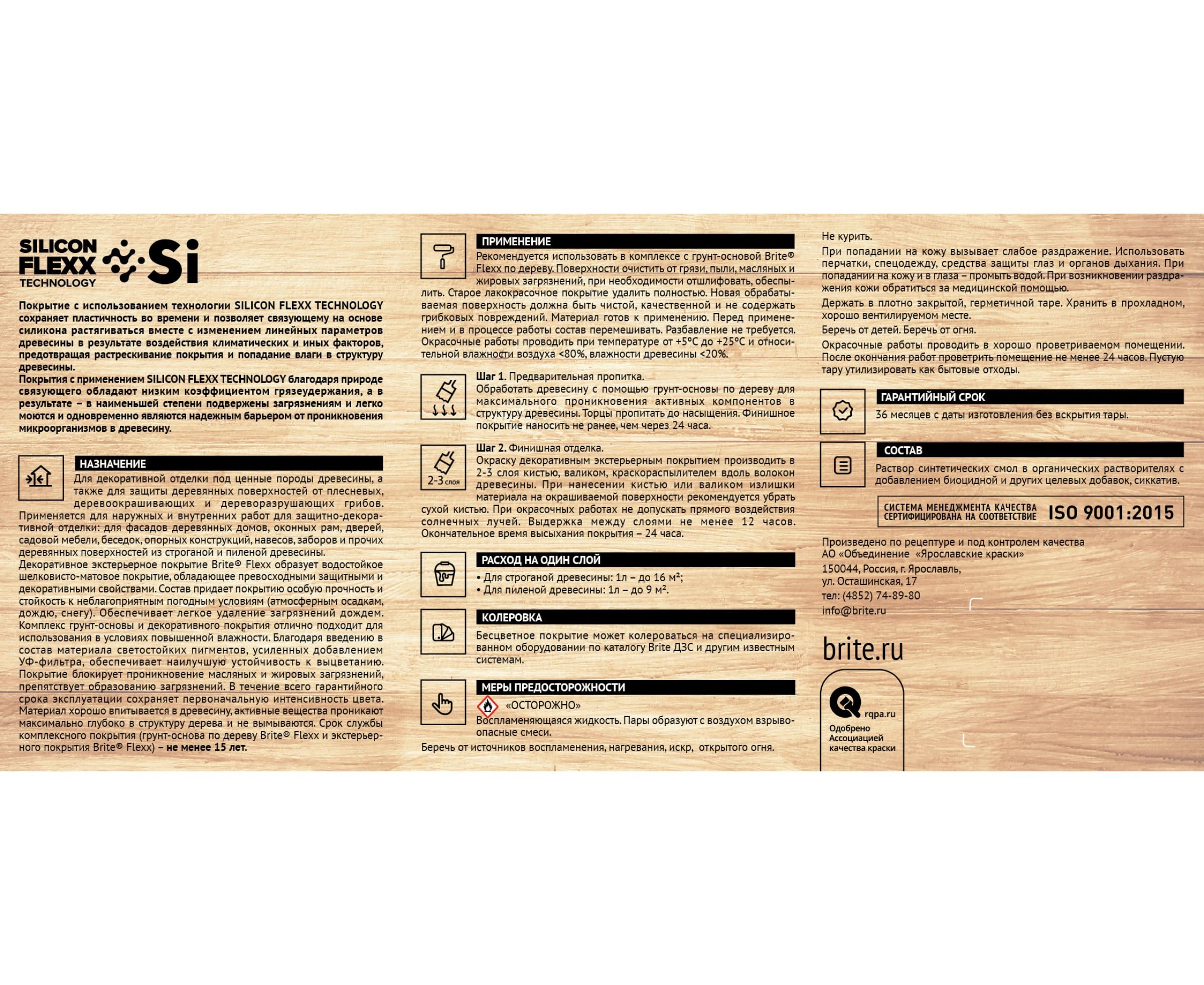 Срок службы комплексного покрытия (грунт-основа по дереву Brite Flexx + экстерьерное покрытие Brite Flexx) – не менее 15 лет.