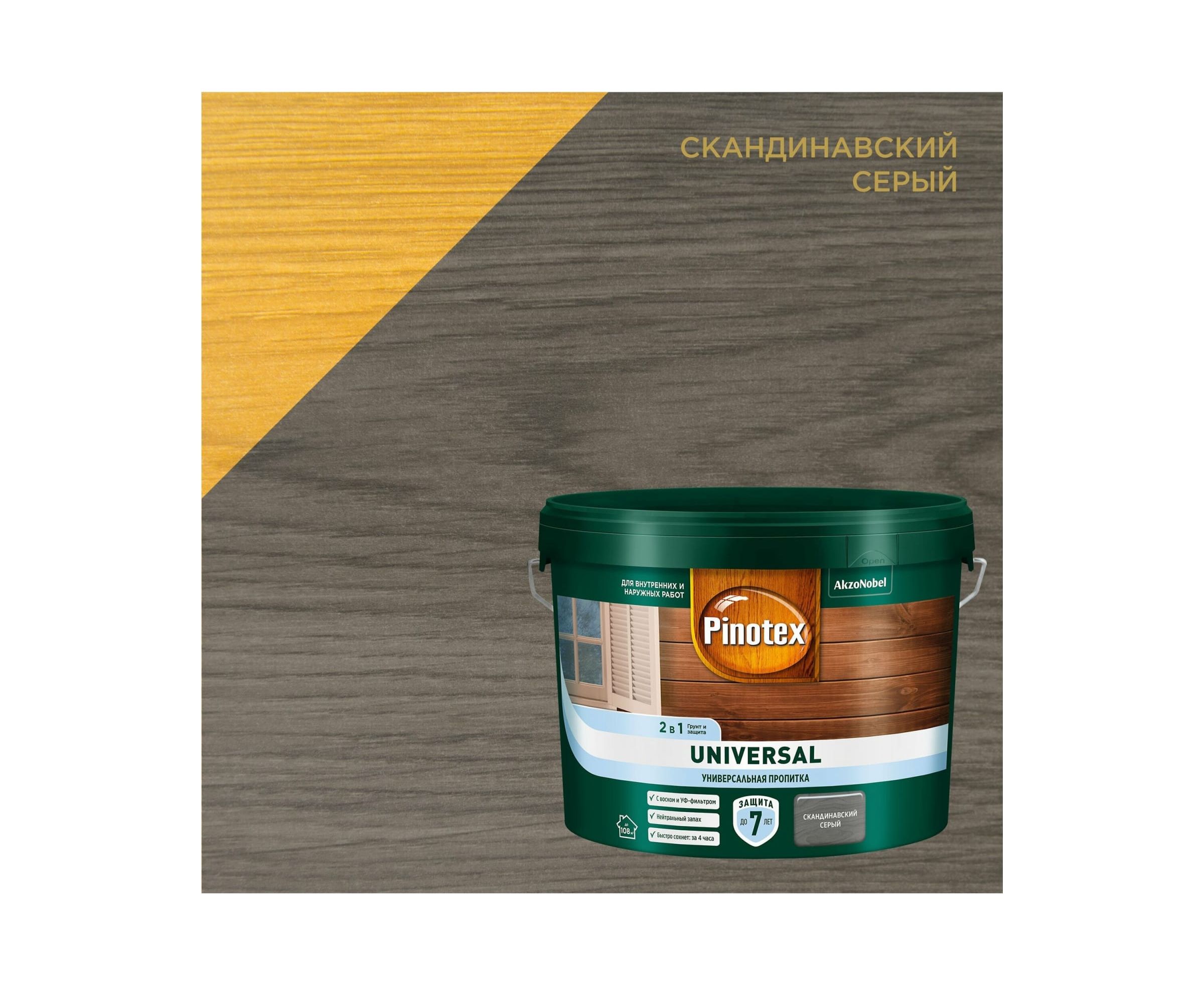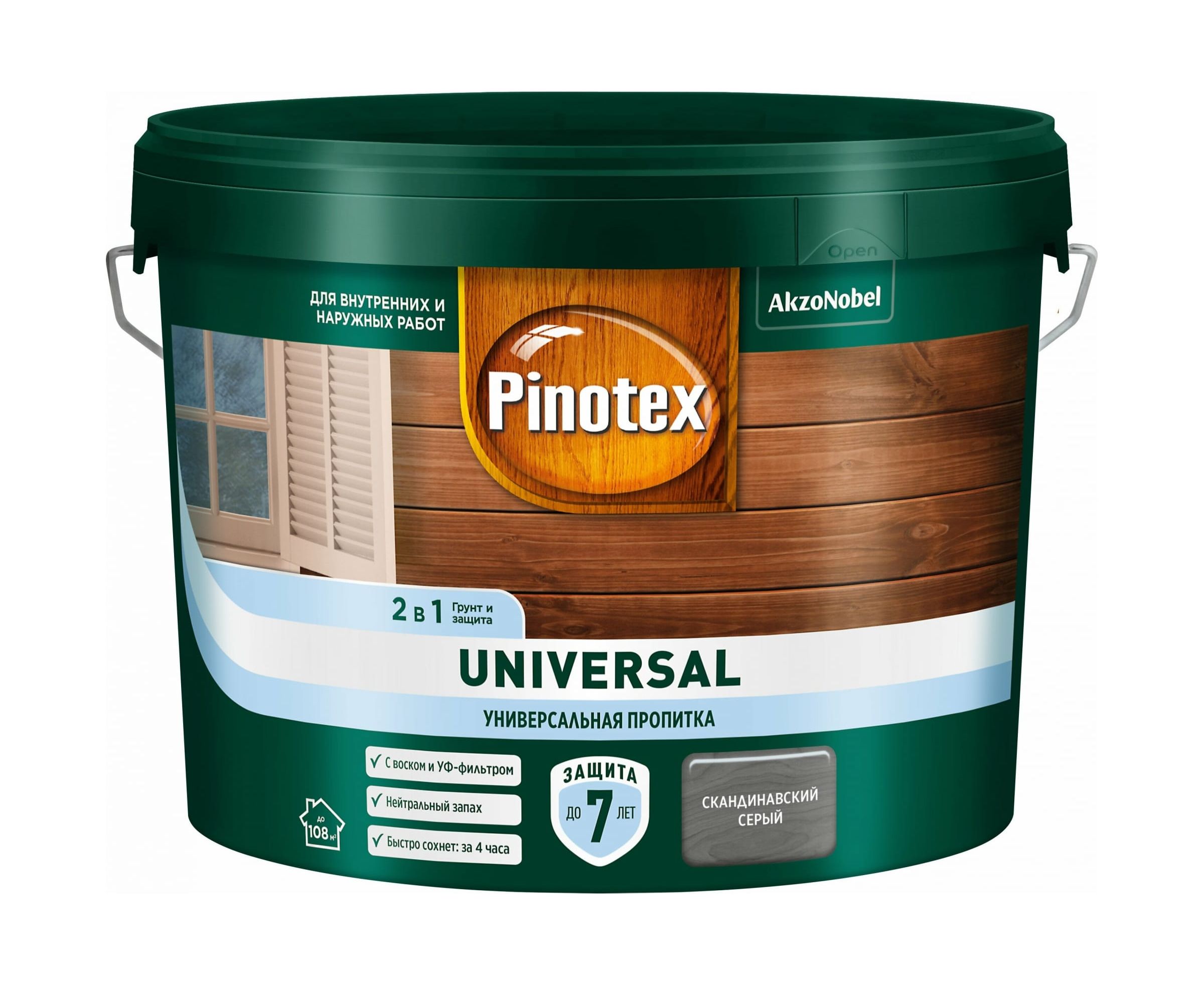 Пропитка 2 в 1 Pinotex UNIVERSAL скандинавский серый, 9 л 5620559 - универсальная пропитка на водной основе для защиты древесины на срок до 7 лет*. Для обработки древесины снаружи и внутри помещений. Формула 2 в 1.