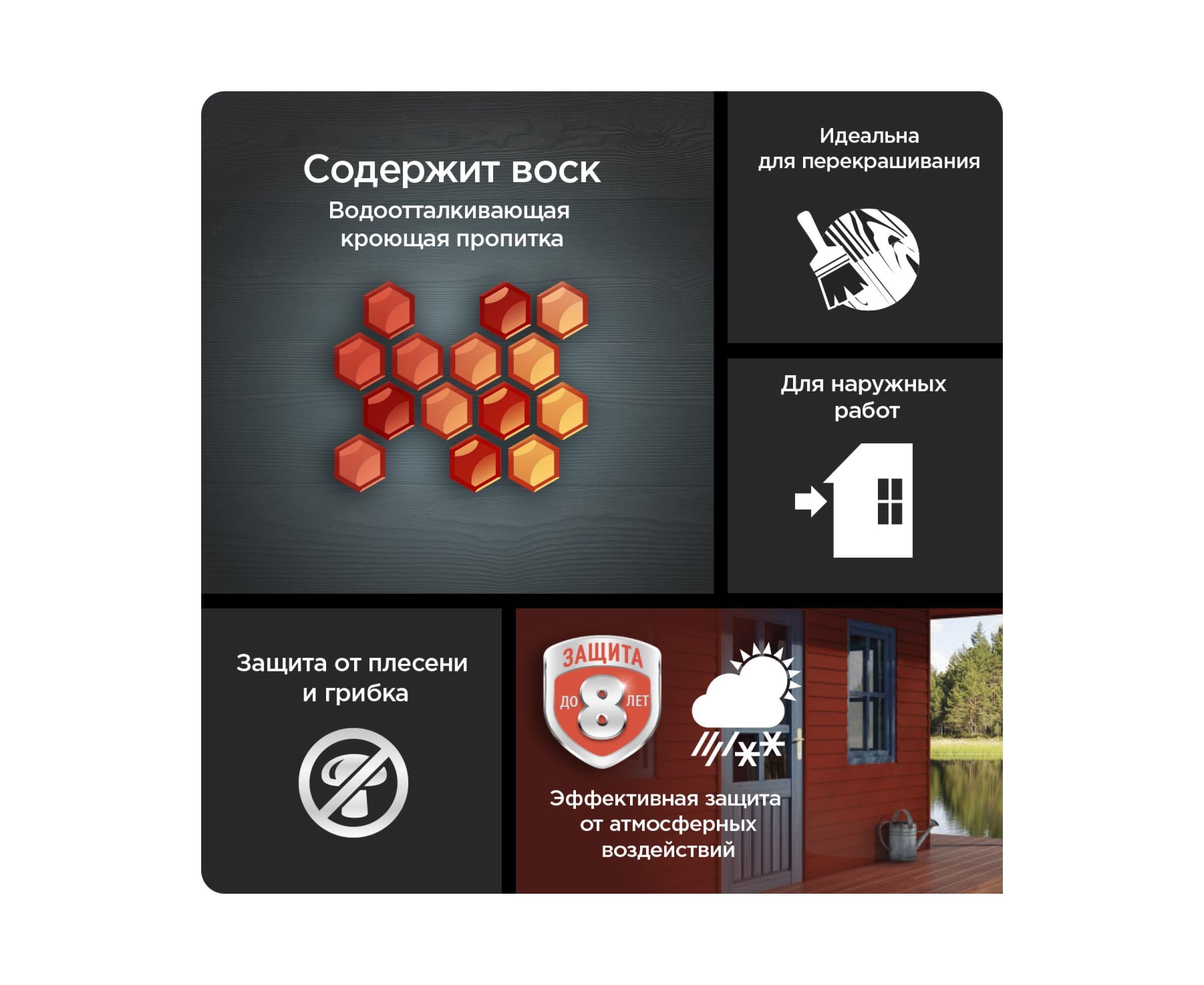Идеально подходит для деревянных фасадов, беседок, заборов, навесов, OSB панелей и других деревянных поверхностей снаружи помещений. Для агрессивных атмосферных условий не рекомендуется использовать пропитку на твердых породах древесины.