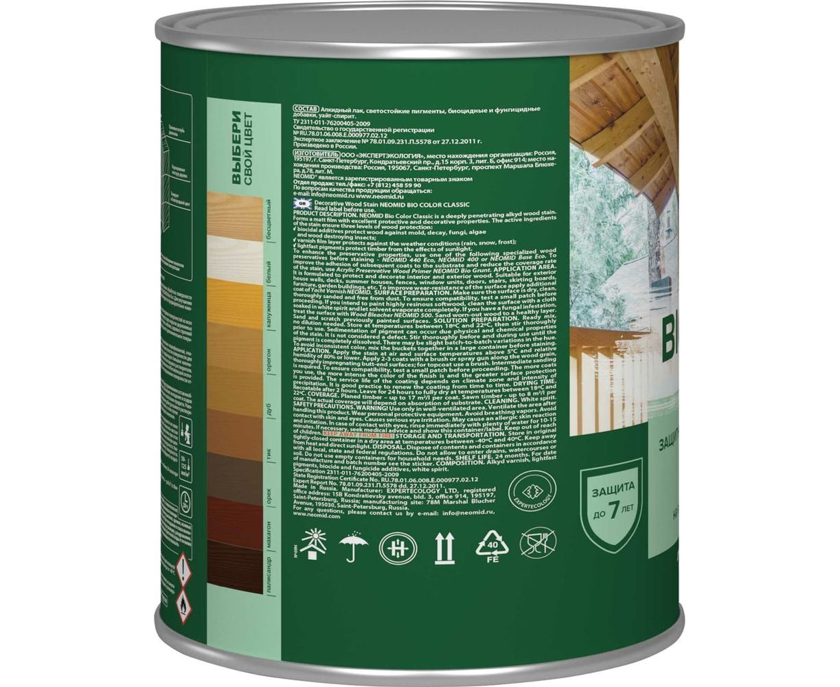 Пропитка NEOMID BIO COLOR CLASSIC бесцветный 0,9 л Н-CLASSIC-0,9/бесц -глубоко проникающий лессирующий декоративный деревозащитный состав. Предназначен для защиты и финишной декоративной отделки поверхности древесины, снаружи и внутри помещений. Сохраняет и подчёркивает естественную структуру древесины. Образует защитный полуматовый слой, обеспечивает защиту древесины от атмосферного воздействия и повышенной влажности, препятствует выцветанию и растрескиванию древесины. Предотвращает образование гнили, плесневых грибов, защищает дерево от поражения насекомыми древоточцами, короедами.