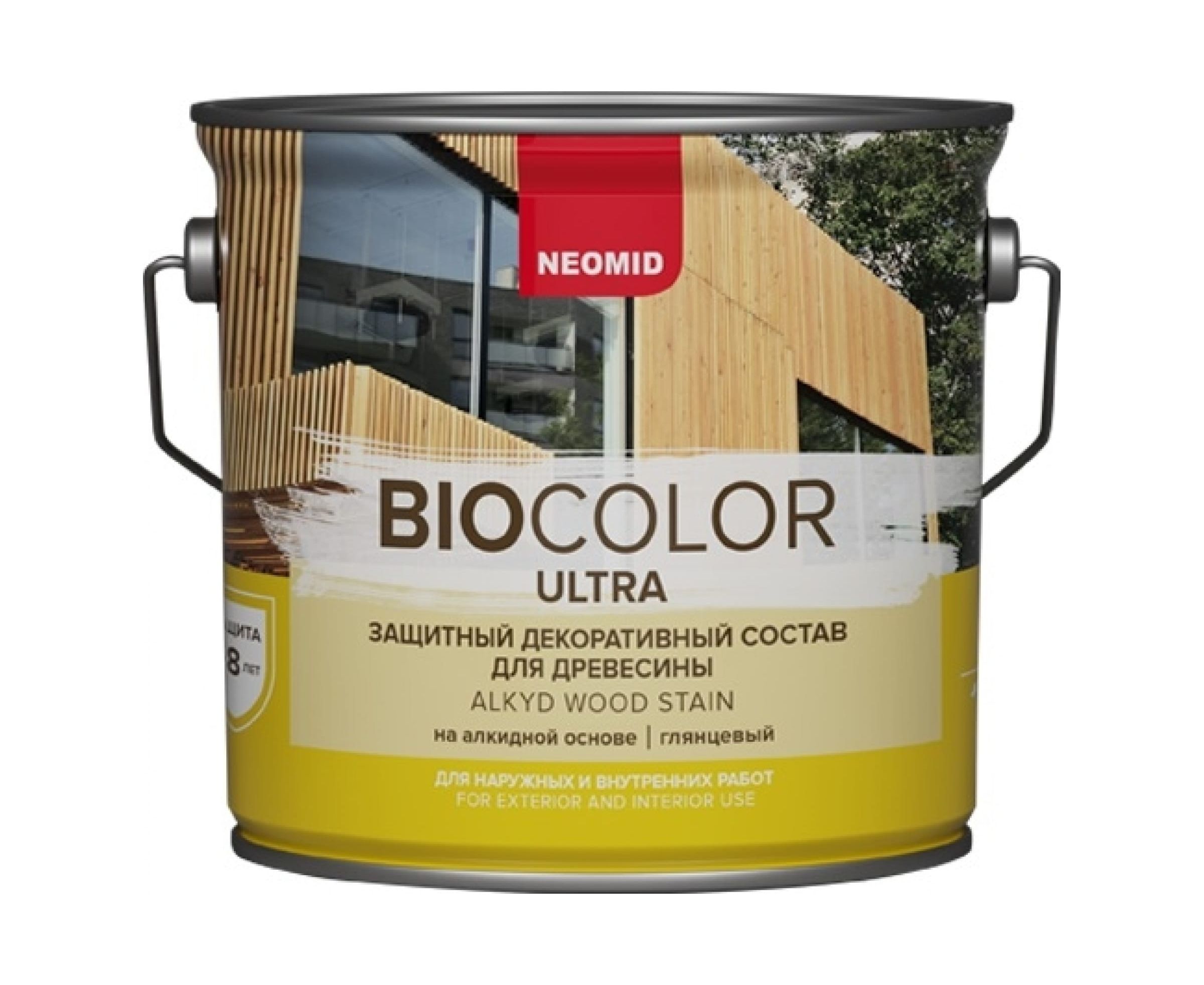 Пропитка Neomid BIO COLOR ULTRA NEW 2020 орегон 2,7 л Н -ULTRA-2,7/орег обеспечивает пятиступенчатую систему защиты древесины благодаря специальным активным добавкам. Продукт после высыхания образует усиленное лаковое покрытие с глянцевым блеском.
