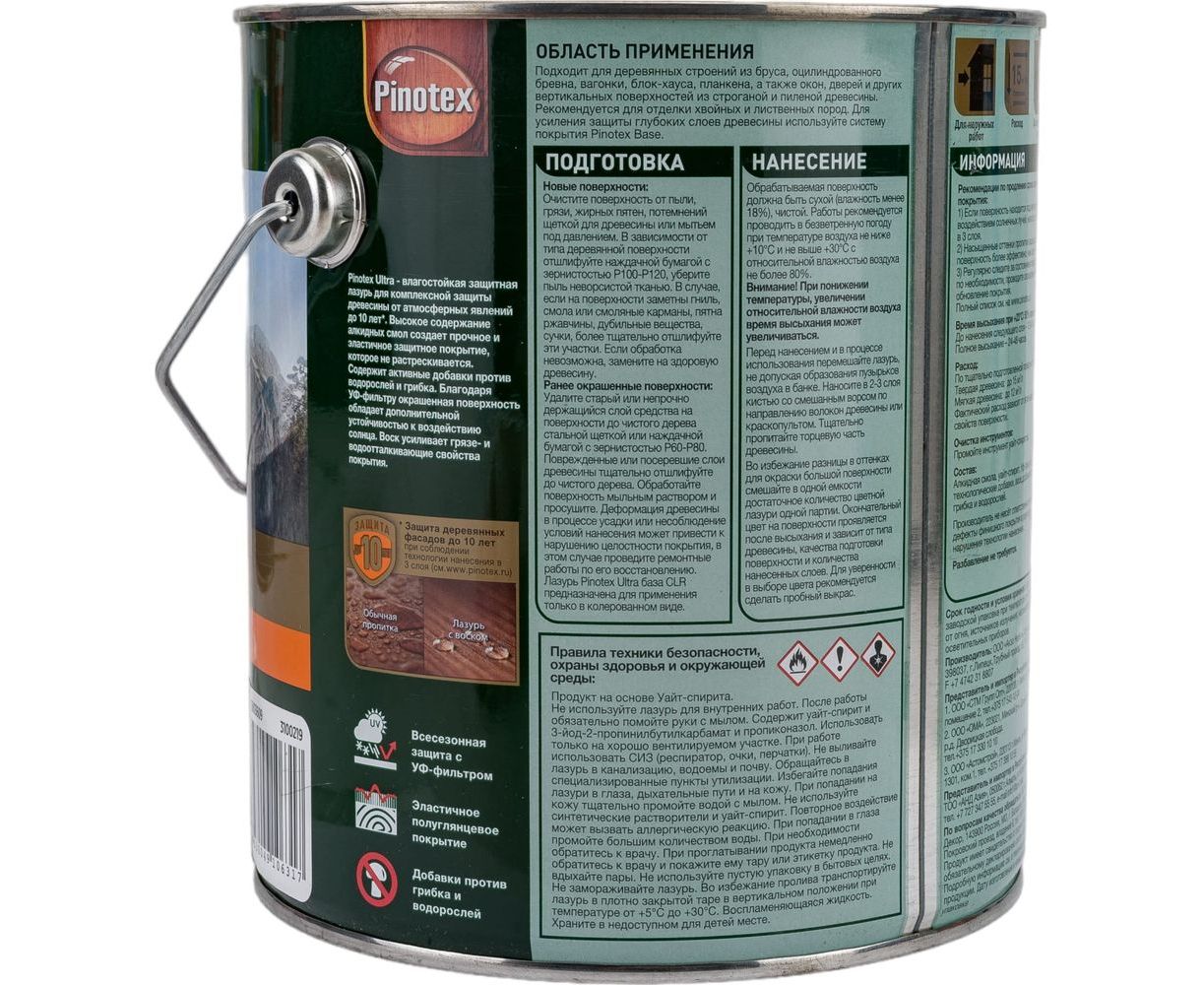 Влагостойкая защитная лазурь для древесины PINOTEX ULTRA NW (база под колеровку; 2.5 л) 5803609 предназначена для комплексной защиты древесины от атмосферных явлений до 10 лет с технологией Трибрид: