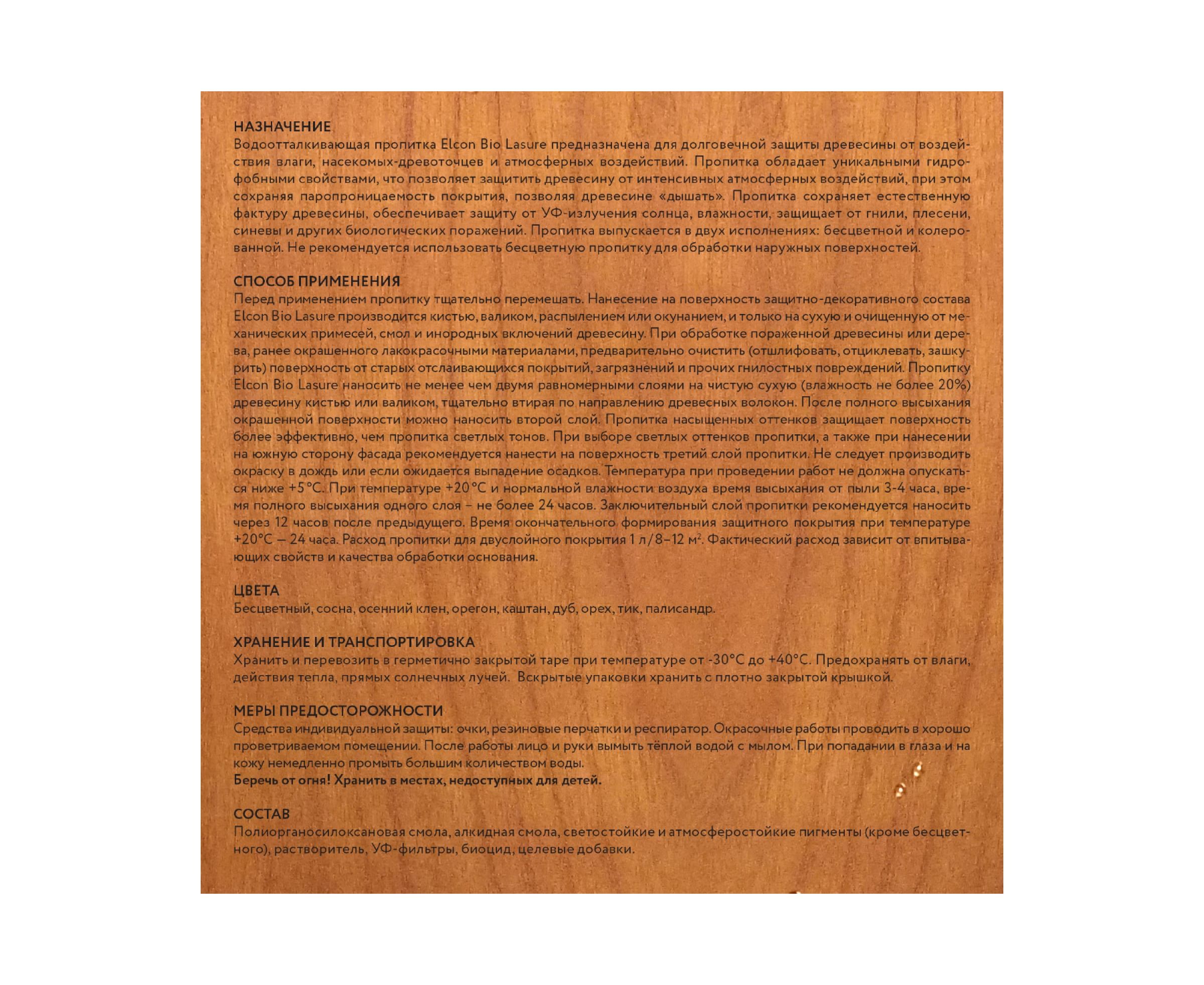 Водоотталкивающая пропитка для защиты дерева до 15 лет, антисептик для дерева, Elcon Bio Lasure осенний клен 2 л, 00-00461949 предназначена для защиты древесины от гниения, плесени, насекомых-древоточцев и атмосферного воздействия. Обладает уникальными водоотталкивающими и паропроницаемыми свойствами. Пропитка содержит двойной УФ-фильтр, что обеспечивает наивысшую степень защиты от УФ-излучения солнца.