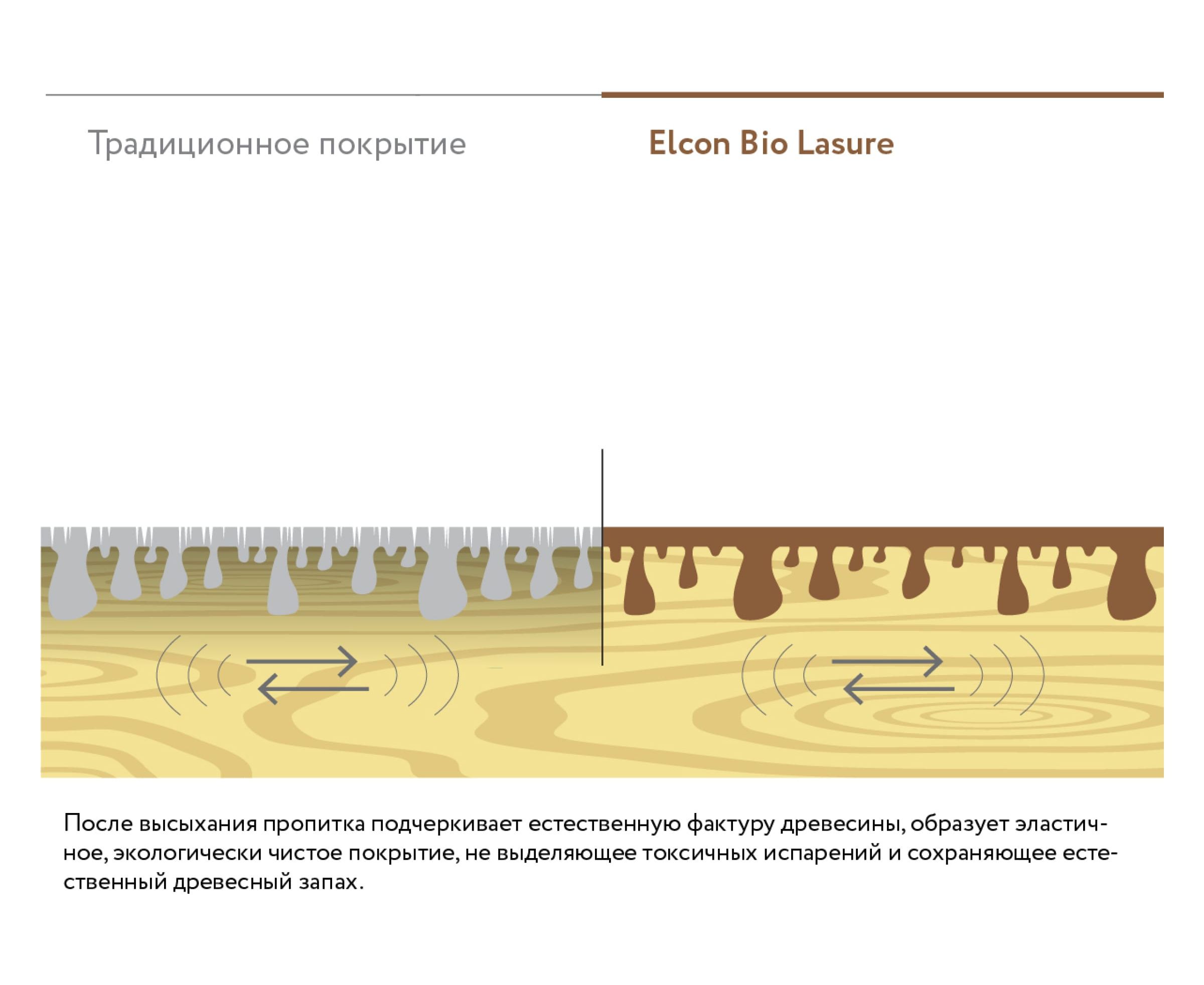 Под воздействием УФ-излучения натуральный цвет древесины блекнет, появляется грязно-серый оттенок, влага снижает плотность и прочность древесины, дерево разбухает. Водоотталкивающие пропитки Elcon созданы на гибридной силикон-алкидной основе и предназначены для финишной отделки и долговременной защиты древесины как снаружи, так и внутри помещений. Благодаря уникальной сетчатой структуре покрытия составы предохраняют древесину от атмосферных воздействий, сохраняя ее паропроницаемость и обеспечивая самоочищение поверхности от грязи.