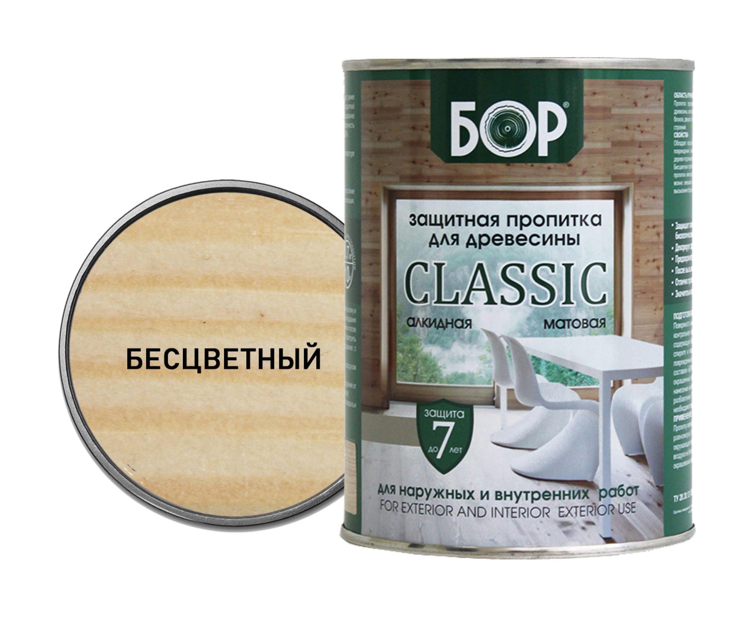 Защитная пропитка для древесины Бор CLASSIC бесцветная, банка 0,7 кг 4690417078622 предназначена для защитно-декоративной отделки изделий из всех видов древесины, эксплуатируемых внутри помещений, а также в атмосферных условиях. Используется для окраски оконных блоков, дверей, лестниц, плинтусов, мебели, деревянных фасадов, заборов, садовых строений и др.