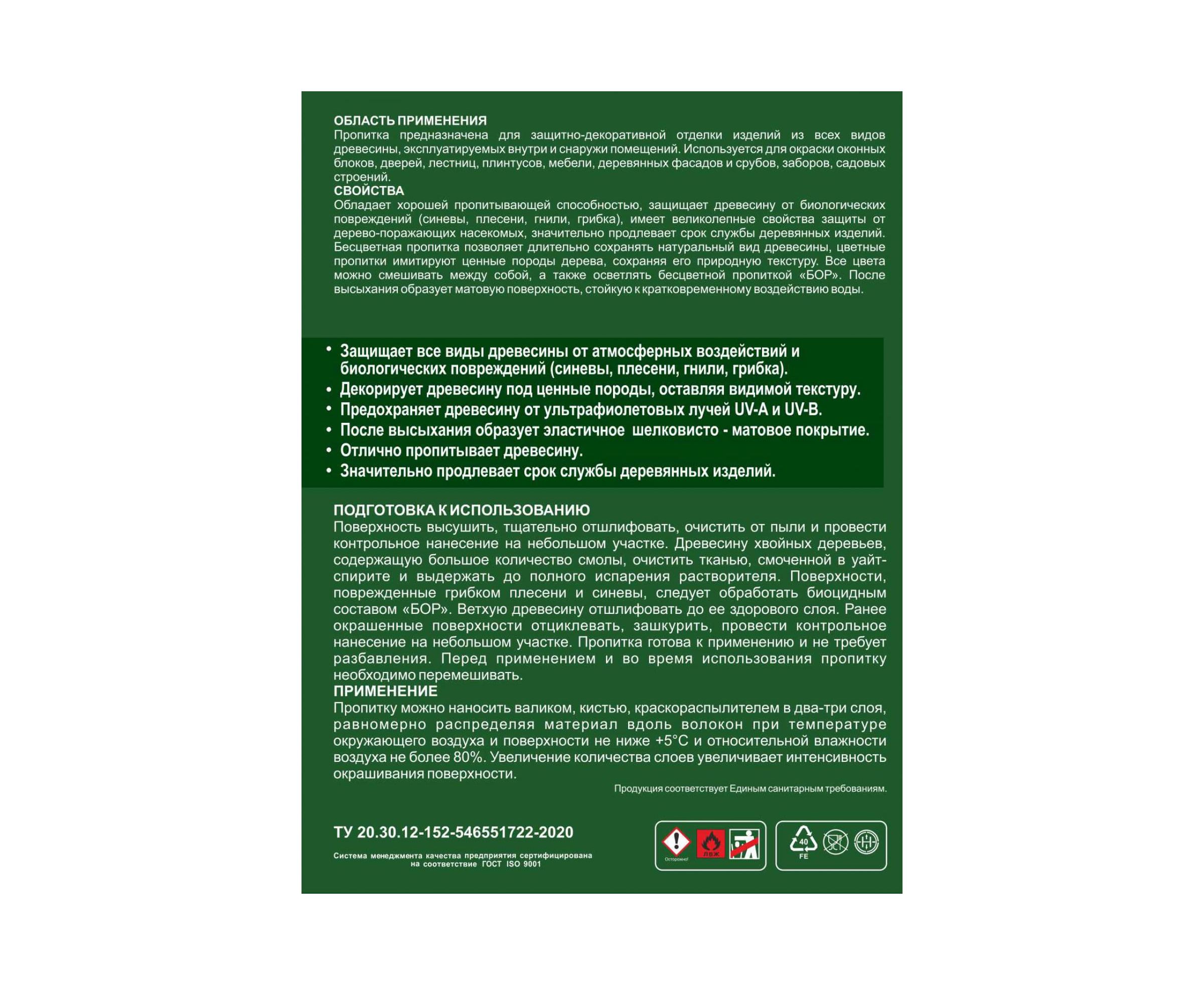 Продукт обладает хорошей пропитывающей способностью, защищает древесину от биологических повреждений (синевы, плесени, гнили, грибка), имеет великолепные свойства отпугивания деревопоражающих насекомых, значительно продлевает срок службы деревянных изделий.