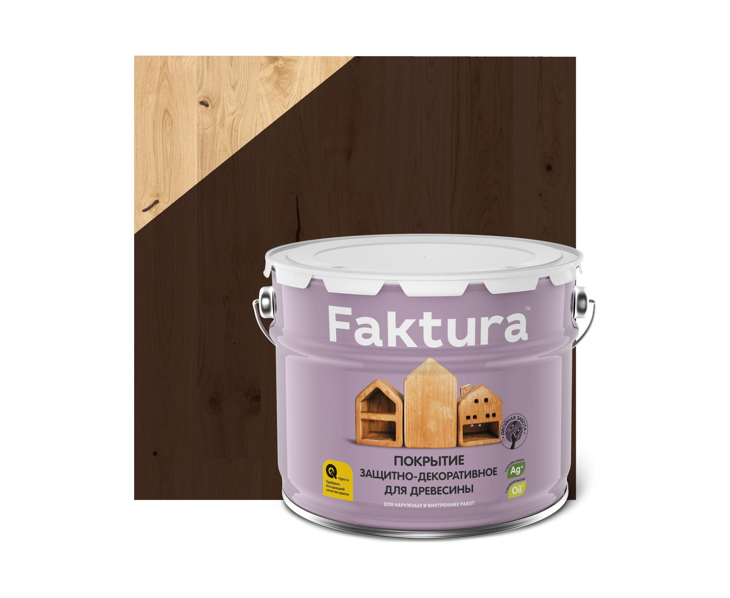 Биозащитное декоративное покрытие для дерева FAKTURA с льняным маслом и ионами серебра, палисандр, ведро 9 л 208444 совмещает в себе свойства глубокопроникающей антисептической грунтовки и декоративно материала.