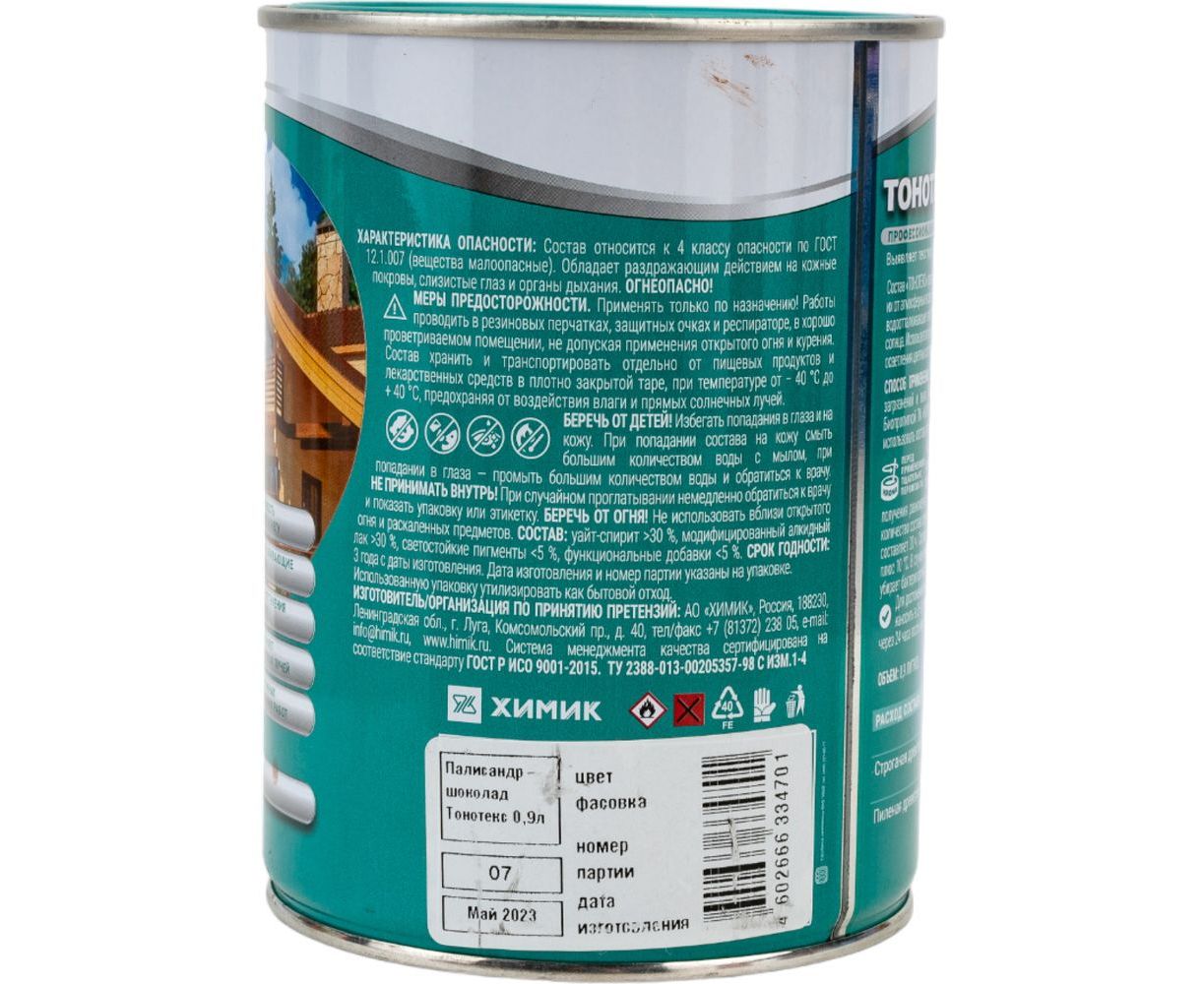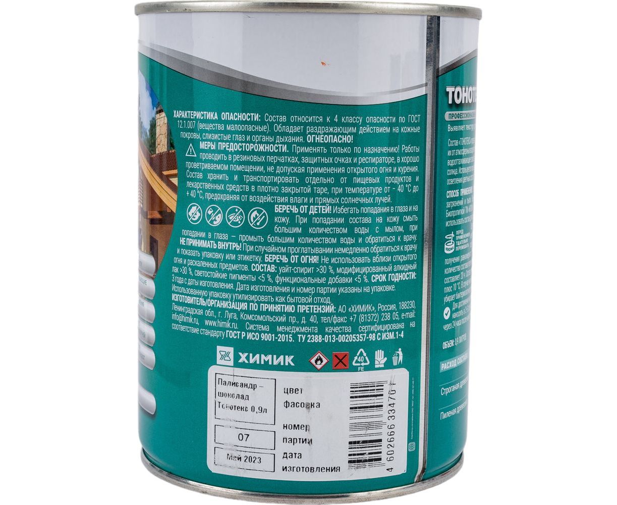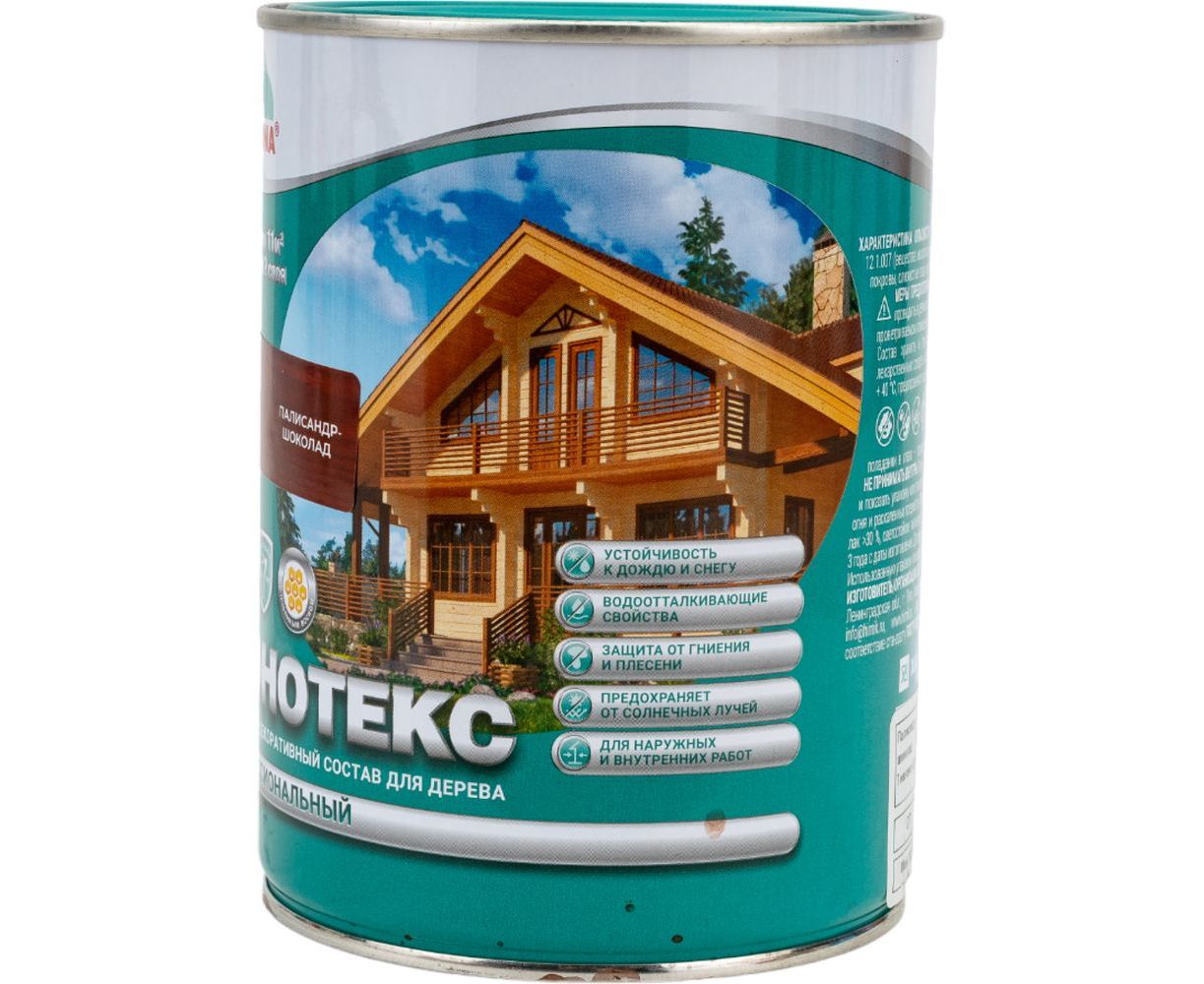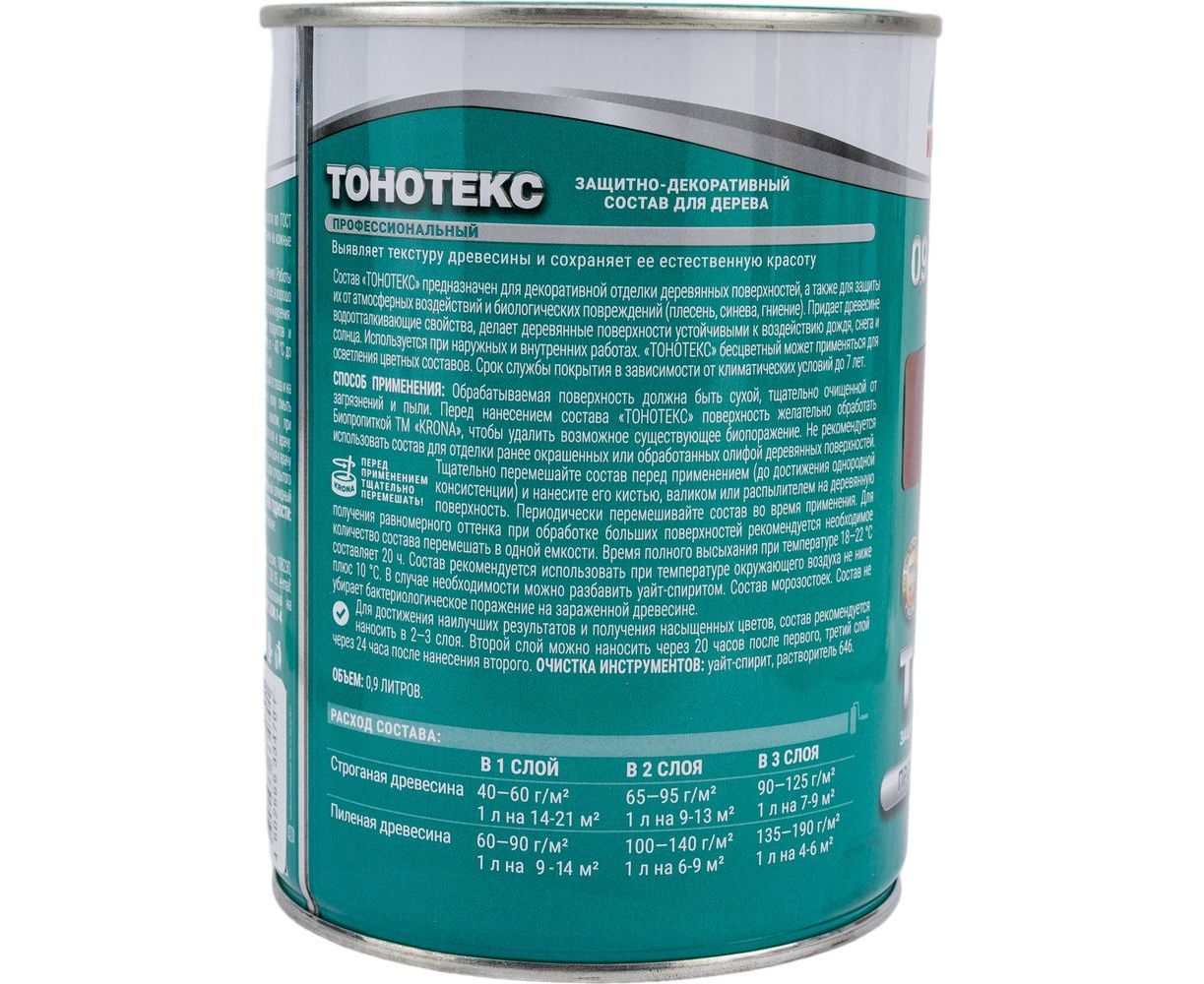 Защитно-декоративный состав для дерева KRONA Тонотекс (палисандр-шоколад; 0,9 л) 66334701 - это алкидный состав, предназначенный для тонирования и защиты деревянных поверхностей снаружи и внутри. Содержит воск для дополнительной защиты от влаги. Обеспечивает защиту от дождя, солнца, гнили, синевы и плесени. Не требует обязательного грунтования, так как первый слой является грунтовочным.