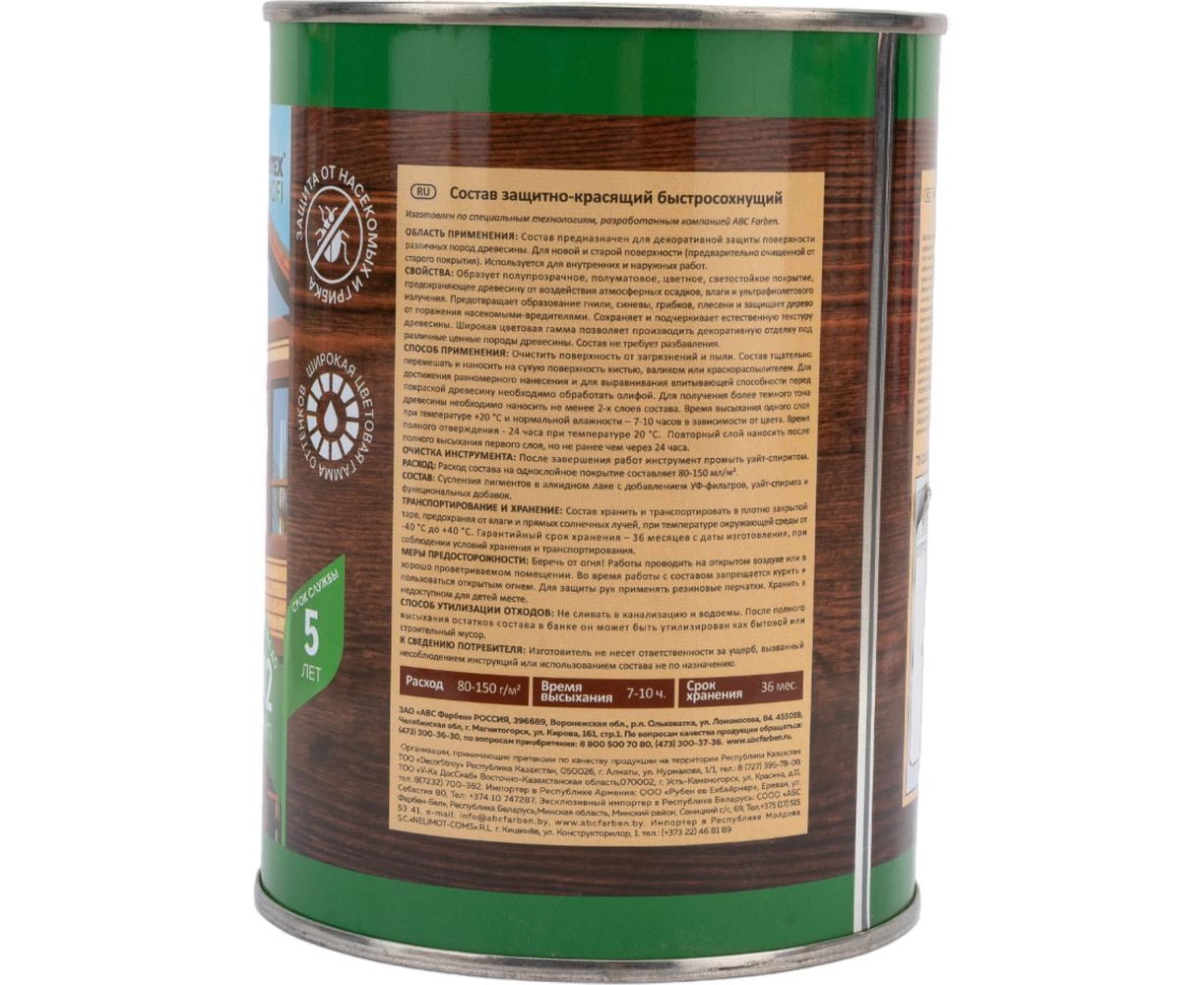 Предотвращает образование гнили, синевы, грибков, плесени и защищает дерево от поражения насекомыми-вредителями. Сохраняет и подчеркивает естественную текстуру древесины. Широкая цветовая гамма позволяет производить декоративную отделку под различные ценные породы древесины. Состав не требует разбавления. Расход 80-150 мл/кв.м.