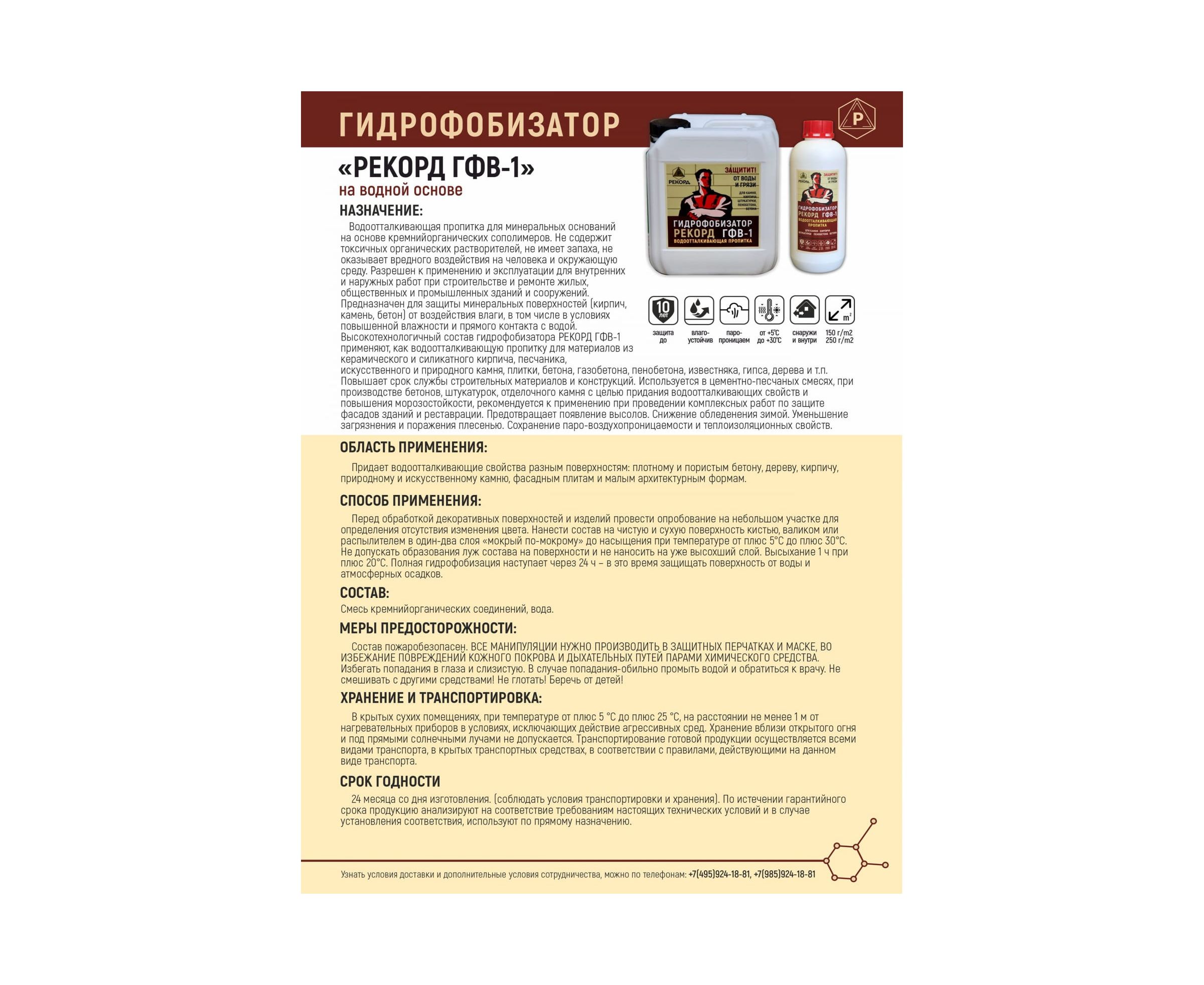 Гидрофобизатор на водной основе РЕКОРД 5 л ГФ02 не содержит токсичных органических растворителей, не имеет запаха, не оказывает вредного воздействия на человека и окружающую среду. Разрешен к применению и эксплуатации для внутренних и наружных работ при строительстве и ремонте жилых, общественных и промышленных зданий и сооружений.