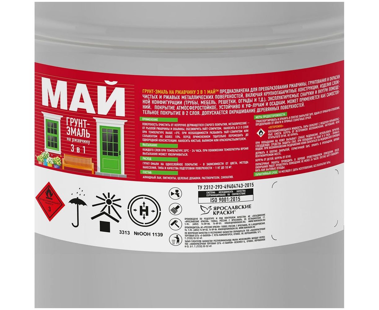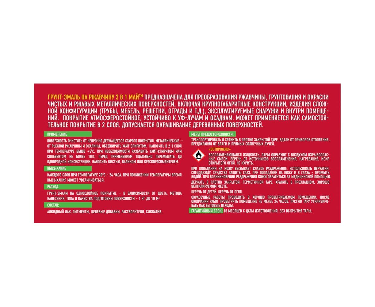 Грунт-эмаль «3в1» МАЙ 211079 предназначена для окрашивания чистых и ржавых металлических поверхностей, включая крупногабаритные конструкции, изделия сложной конфигурации (решетки, трубы, ограды и т.д.), эксплуатируемые в атмосферных условиях. Допускается окрашивание деревянных поверхностей.