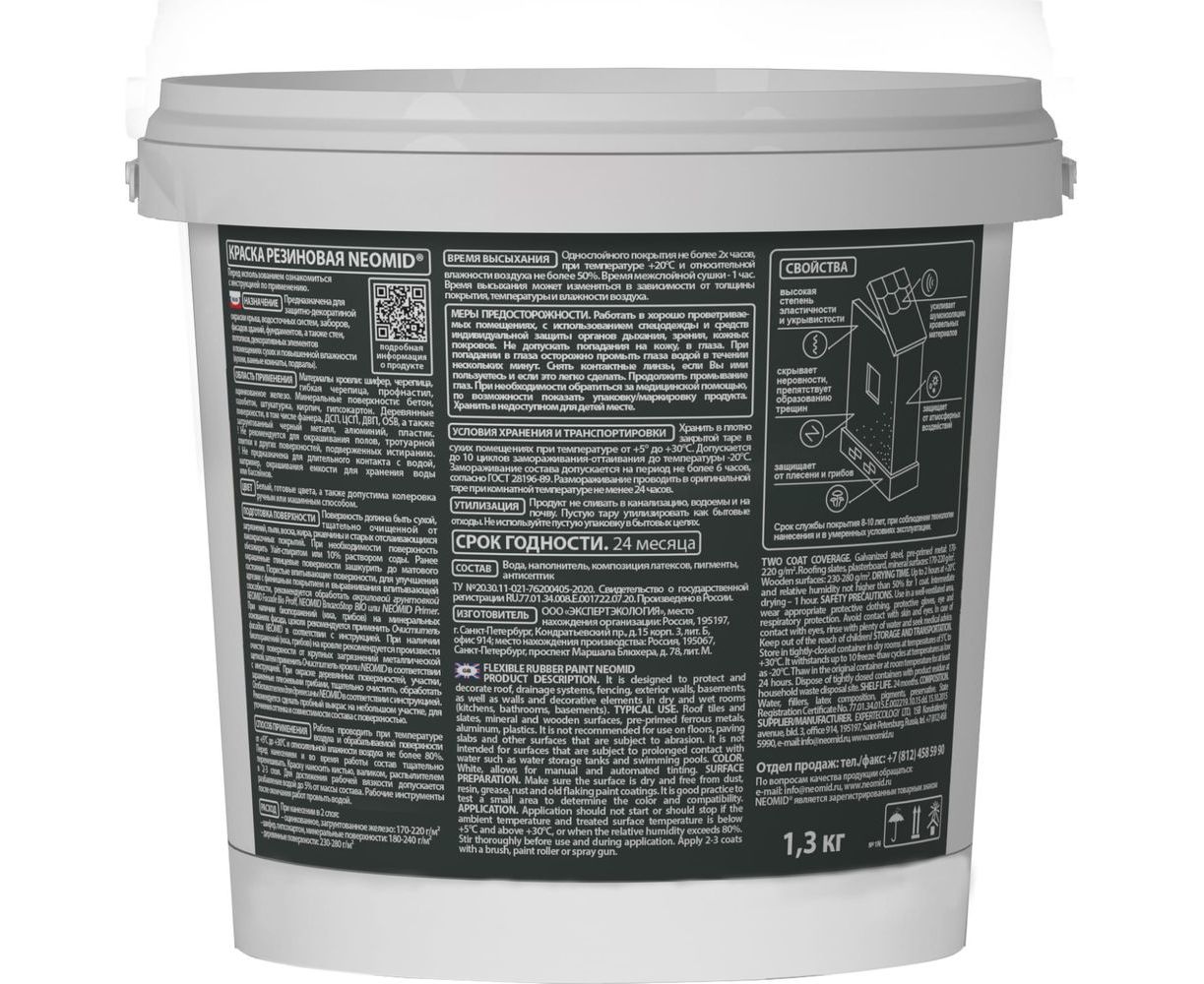 Резиновая краска Neomid Хаки 1,3 кг Н-КраскаРез-1,3-Хаки предназначена для защитно-декоративной окраски поверхностей из дерева, ДСП, ЦСП, ДВП, OSB, бетона, газобетона, материалов жесткой и мягкой кровли (шифер, черепица, гибкая черепица, профнастил, оцинкованное железо).