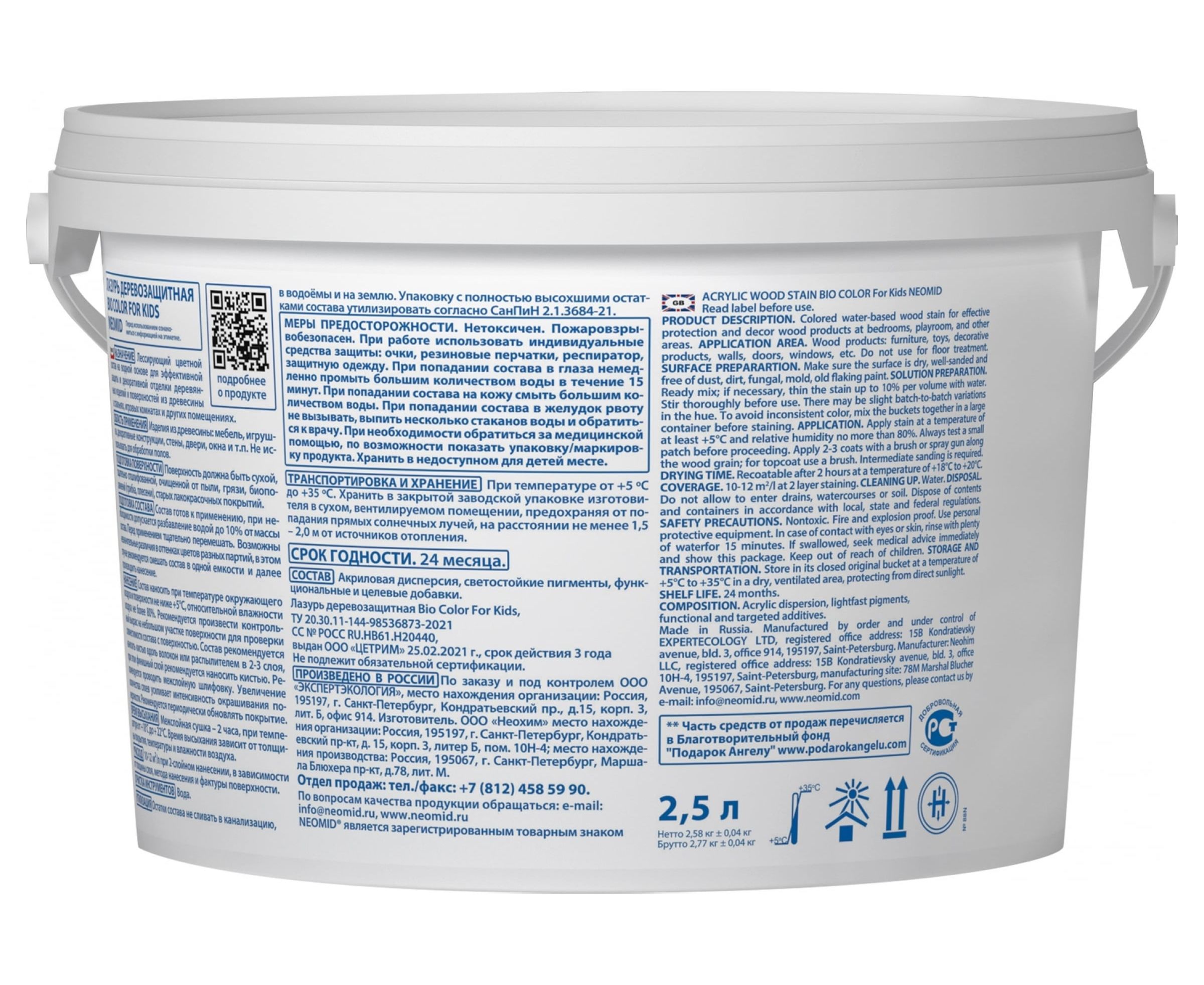 Лазурь синяя Neomid Bio Color For Kids 2,5 л Н-BCFK-2,5/син - лессирующий цветной состав на водной основе для эффективной защиты и декоративной отделки деревянных изделий и поверхностей из древесины в спальнях, игровых комнатах и других помещениях.