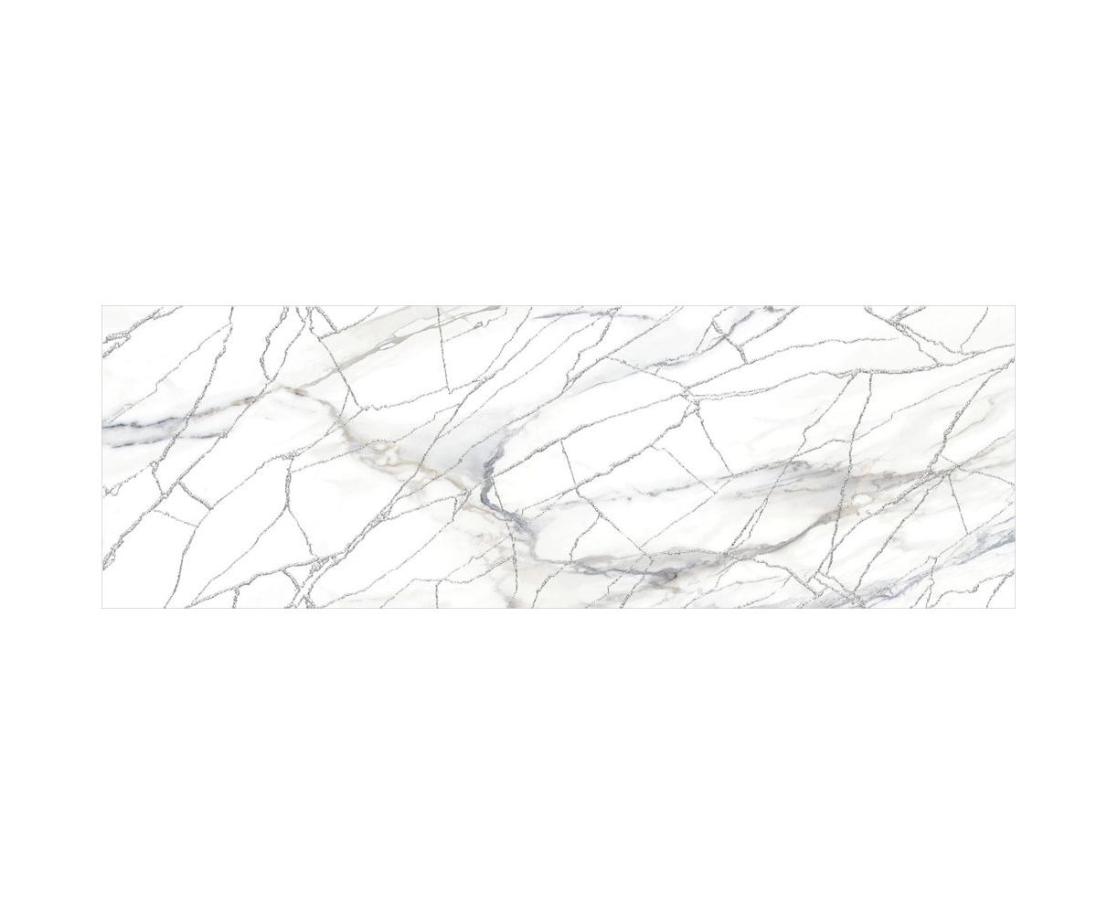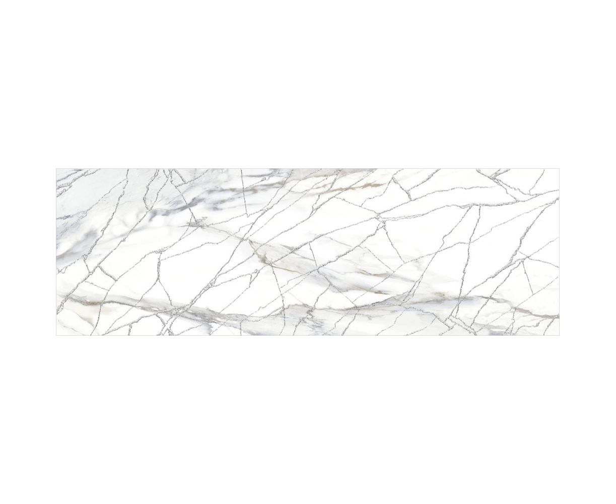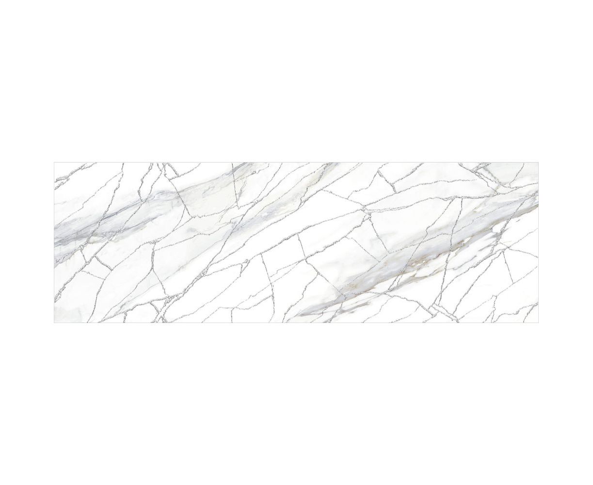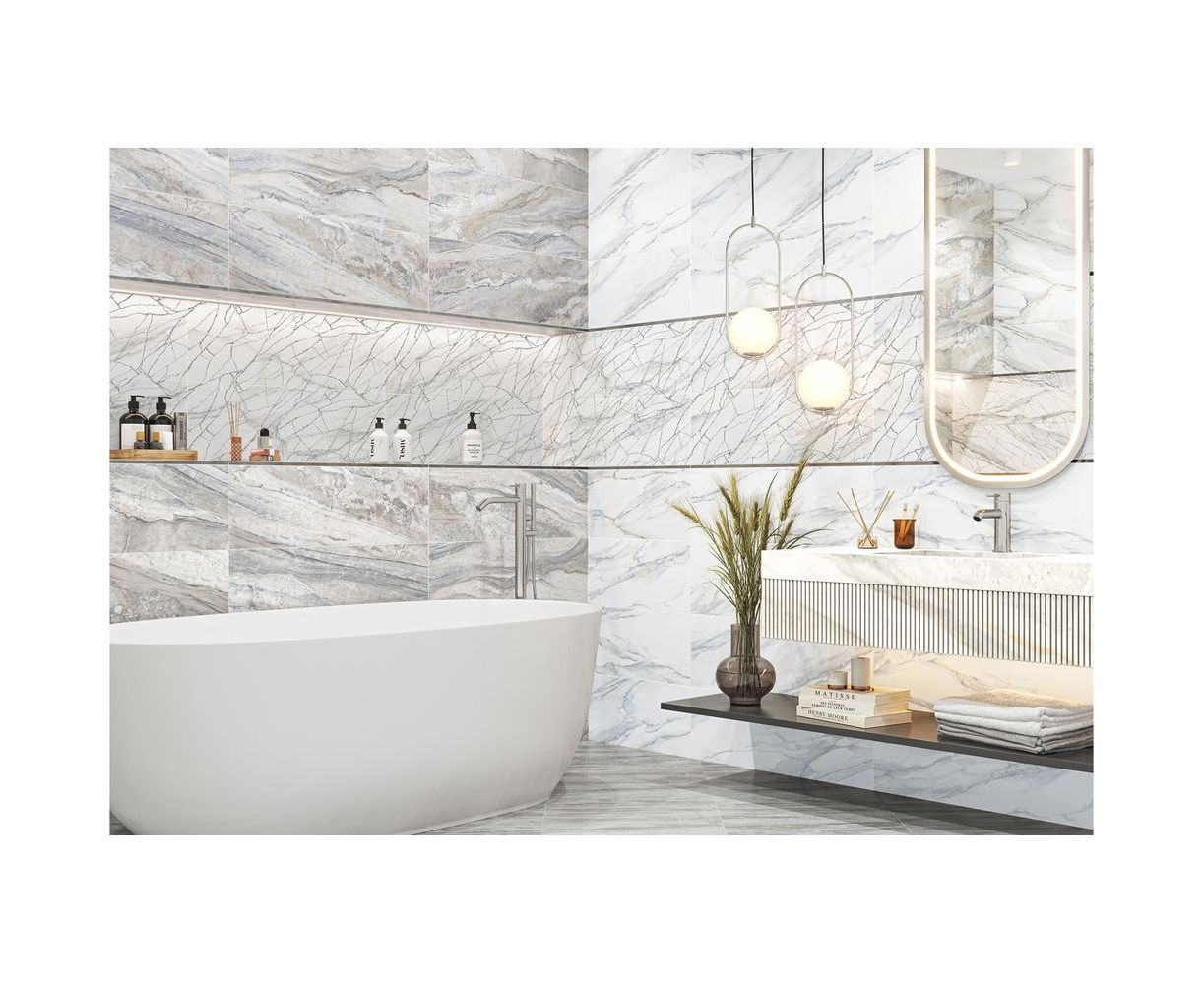 Голубая Калакатта с теплыми прожилками и многоцветный индонезийский мрамор с глубокой текстурой дополняют друг друга и сочетаются между собой по тональности. Акцентным элементом коллекции выступает витиеватая сетка из белого золота с мерцающим глиттером. Этот декор стыкуется и создаёт в интерьере современный разноразмерный узор, который переливается и играет от лучей света, направленных на него.