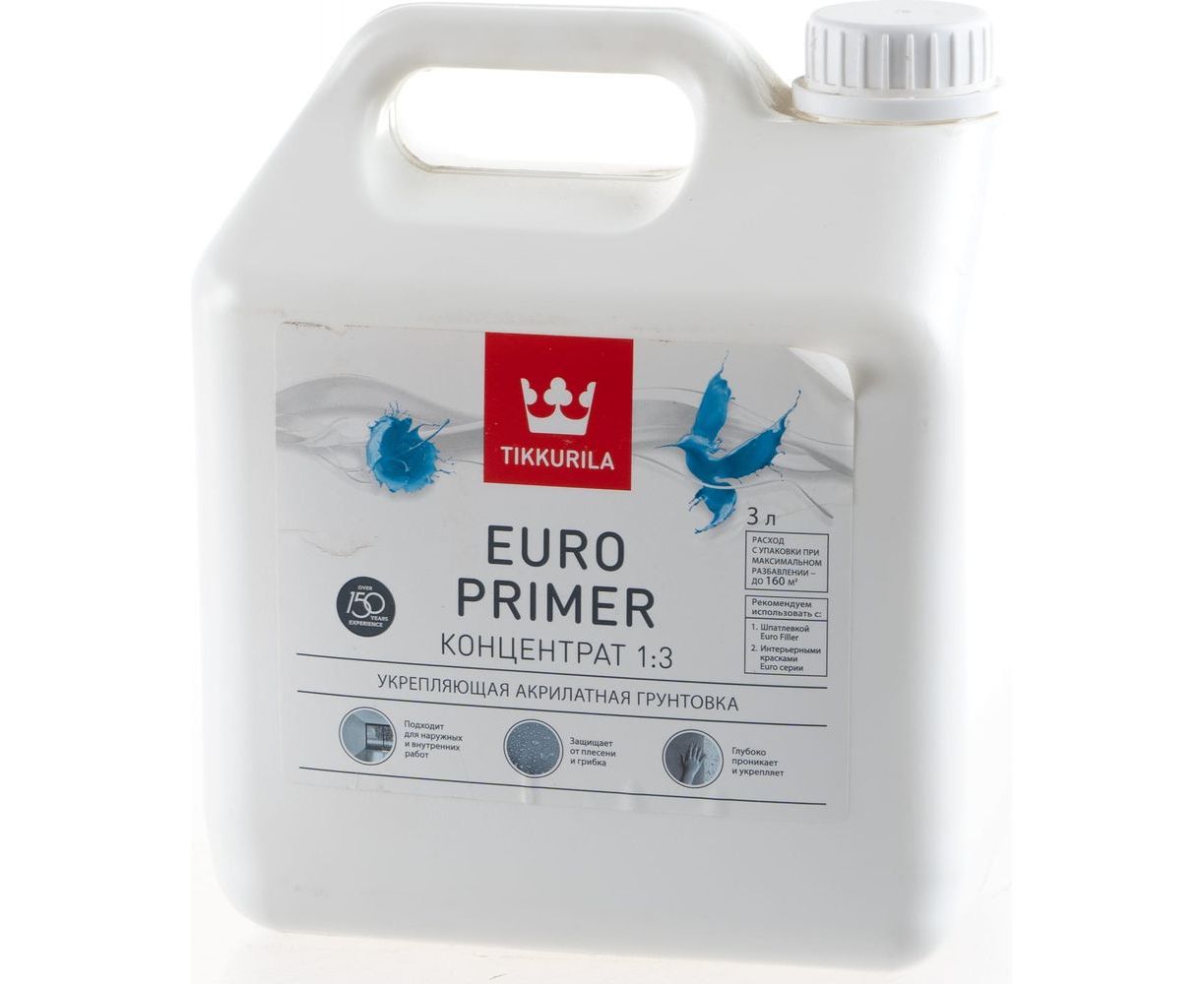 Акриловая грунтовка Tikkurila ЕВРО ПРАЙМЕР 3 л КОНЦЕНТРАТ 26141 используется для подготовки поверхности перед нанесением краски. Подходит для наружных и внутренних работ.