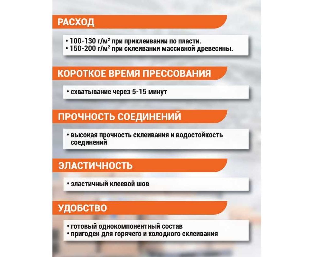 Расход: 100-130 г/кв. м при приклеивании по пласти; 150-200 г/кв. м при склеивании массивной древесины.