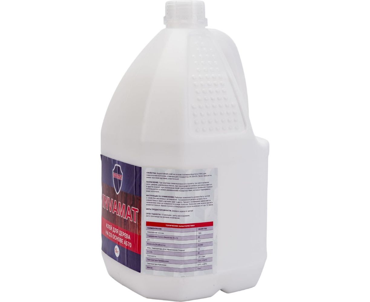 Клей столярный ПВА на D3 основе INVAMAT А570 (пластиковое ведро) 5 кг 1148 - водостойкий клей на основе гомополимерной эмульсии поливинилацетата, отвечающий стандартам EN 204-D3. Легко наносится, имеет высокую адгезию, эластичный.