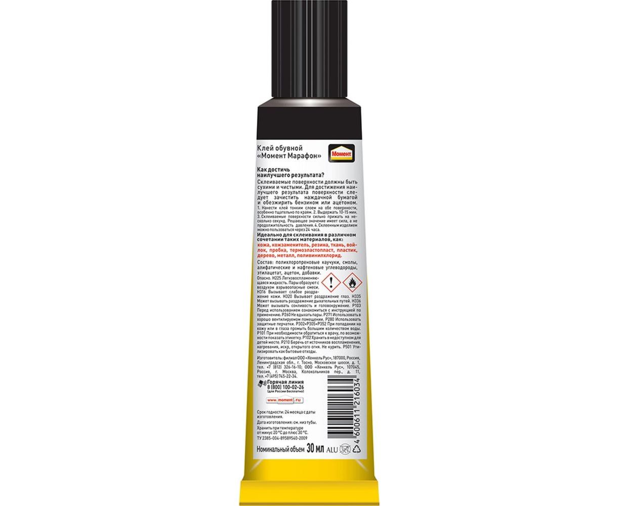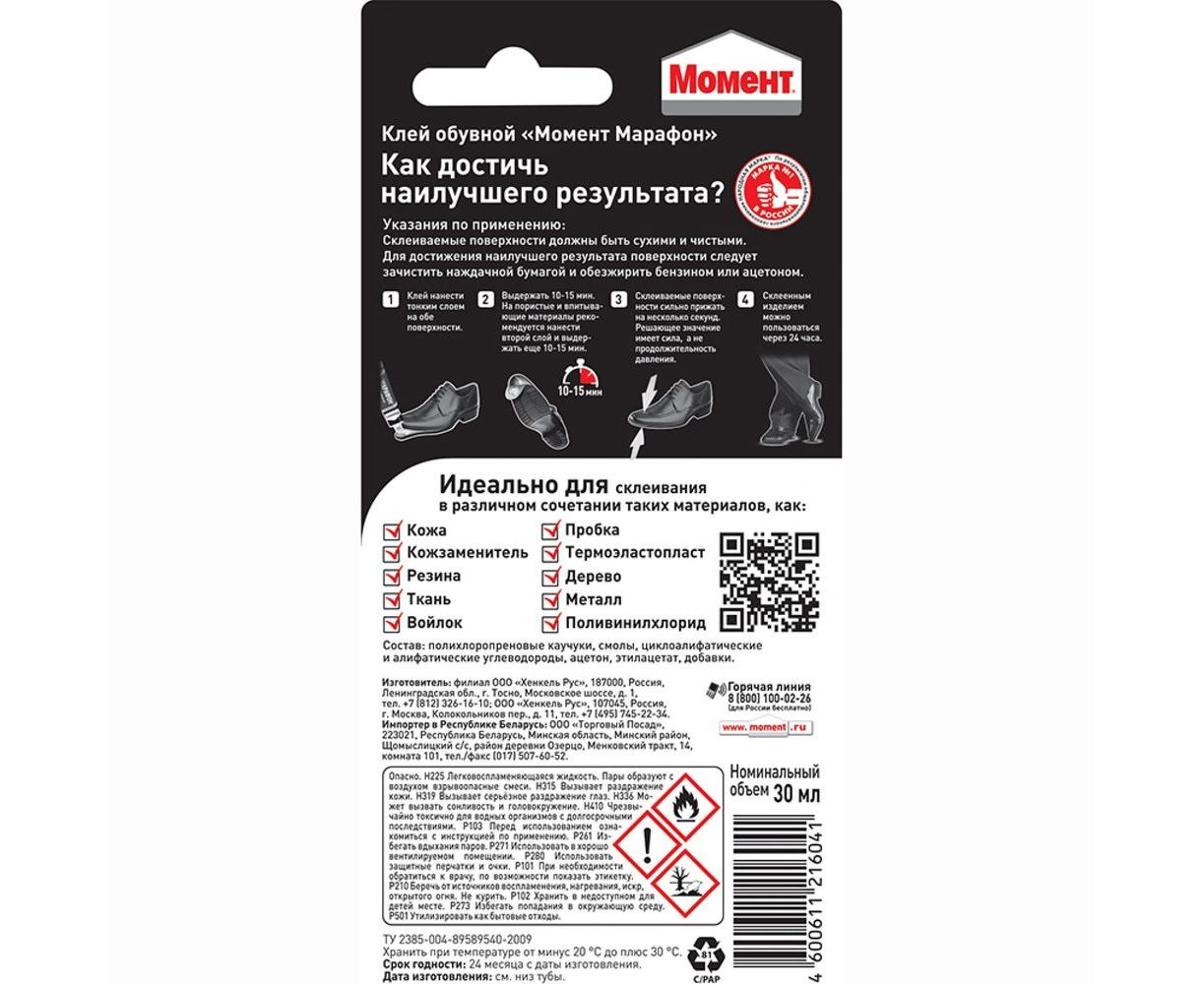 Клей для обуви Момент Марафон 30 мл БЛ1 Б0008044 422987 - надежный водостойкий и морозостойкий клей для ремонта обуви.