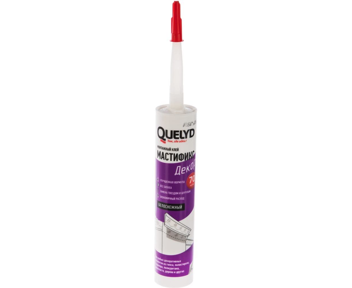 Монтажный клей QUELYD MASTIFIX Декор 530 гр 12012027 предназначен для крепления легких декоративных элементов, карнизов, плинтусов к деревянным, кирпичным, каменным, оштукатуренным и бетонным поверхностям.