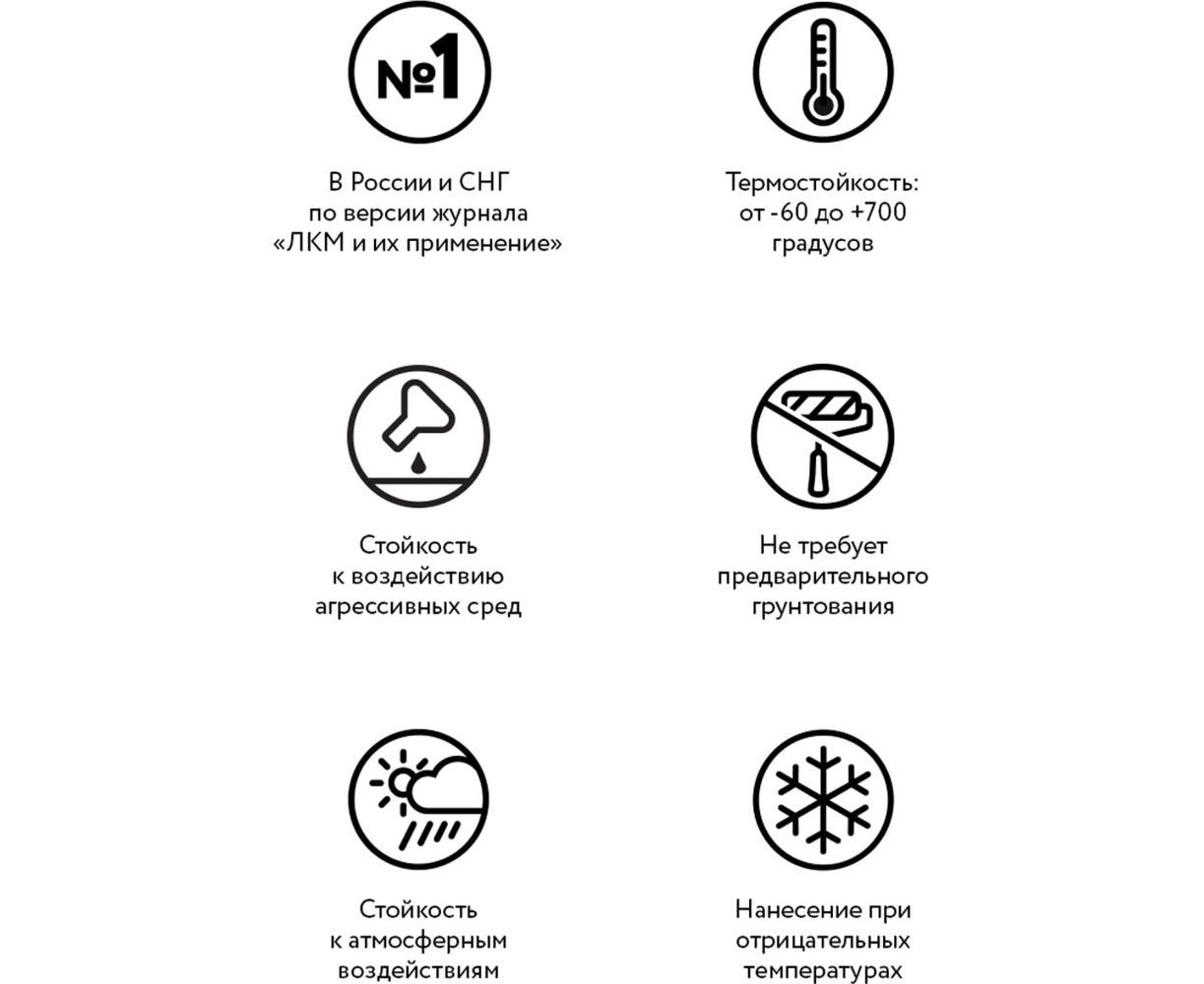 Состав легко наносится без предварительного грунтования основания и быстро сохнет, образуя однородную гладкую пленку. Финишное покрытие обладает хорошей устойчивостью к возникновению коррозии, перепадам температуры и воздействию агрессивной среды (солевой туман, бензин, минеральное масло).
