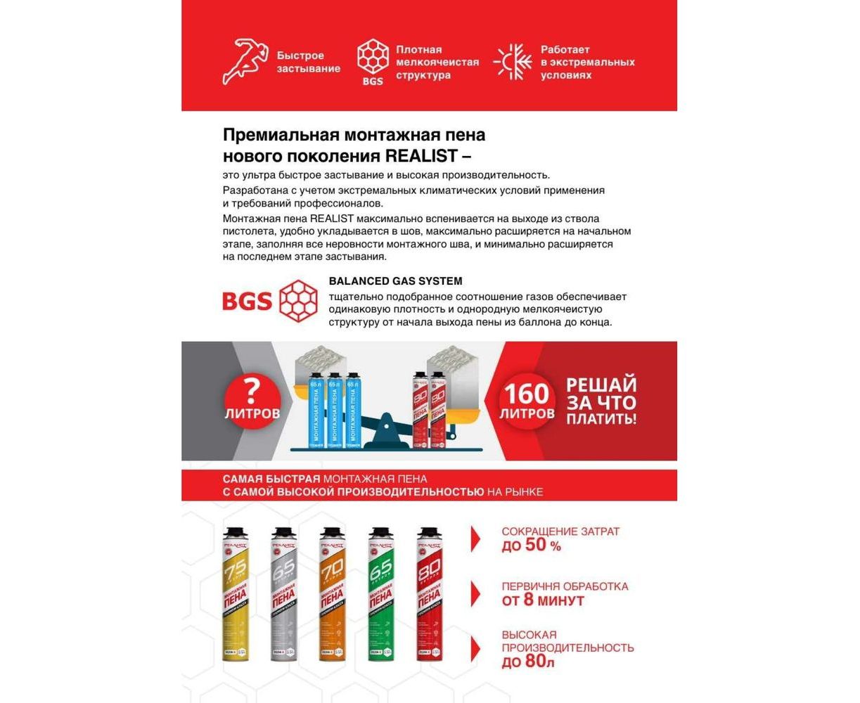 Пена монтажная REALIST PRO Green 65 л 4602009041020 - это ультра быстрое застывание и высокая производительность. Разработана с учетом экстремальных климатических условий применения и требований профессионалов. Монтажная пена REALIST максимально вспенивается на выходе из ствола пистолета, удобно укладывается в шов, максимально расширяется на начальном этапе, заполняя все неровности монтажного шва, и минимально расширяется на последнем этапе застывания.