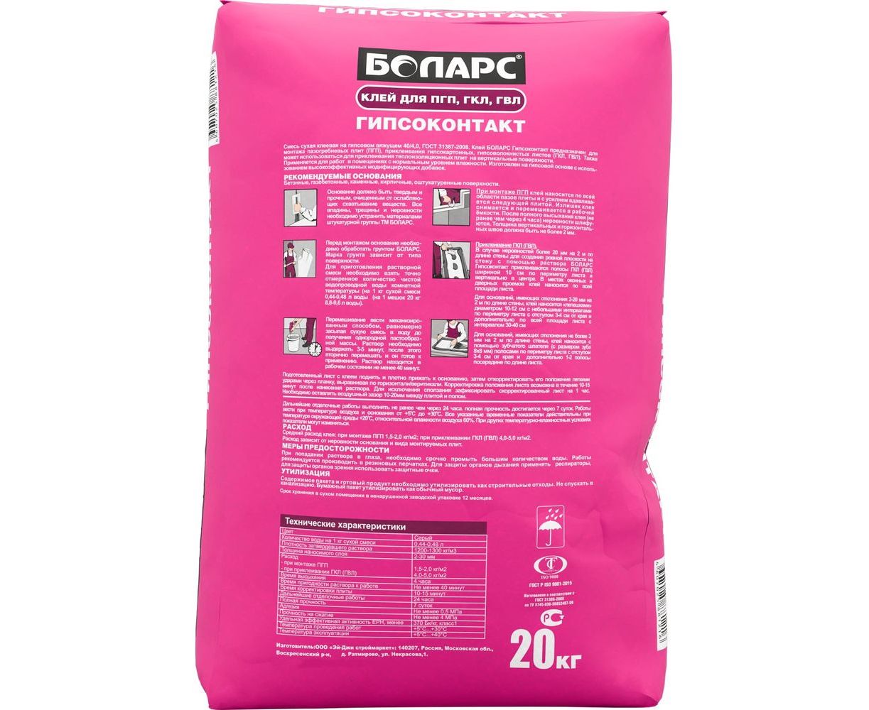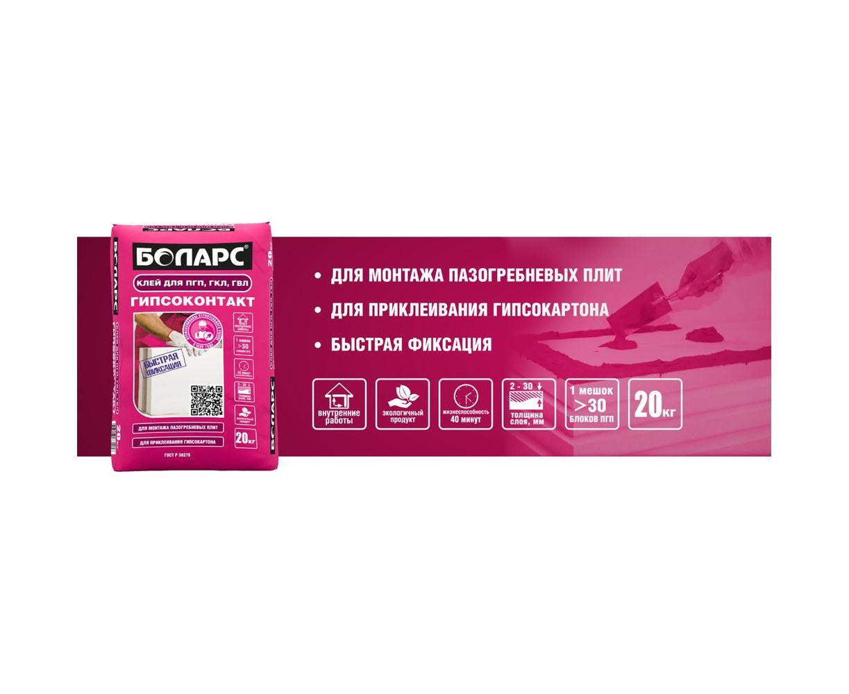Клей БОЛАРС Гипсоконтакт 20 кг 00000003728 предназначен для монтажа пазогребневых плит (ПГП), приклеивания гипсокартонных, гипсоволокнистых листов (ГКЛ, ГВЛ). Также может использоваться для приклеивания теплоизоляционных плит на вертикальные поверхности.