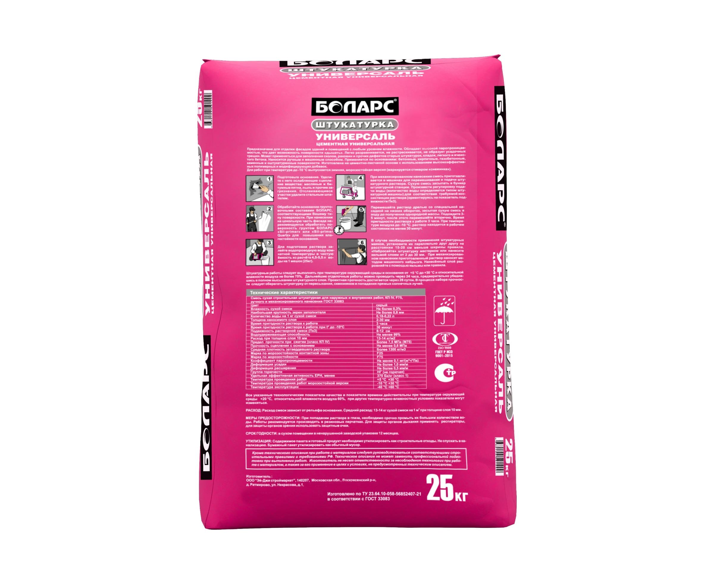 Цементная универсальная штукатурка БОЛАРС УНИВЕРСАЛЬ 25 кг 00000040984 предназначена для отделки фасадов зданий и помещений с любым уровнем влажности. Изготовлена на цементно-песчаной основе с использованием высокоэффективных полимерных и модифицирующих добавок.