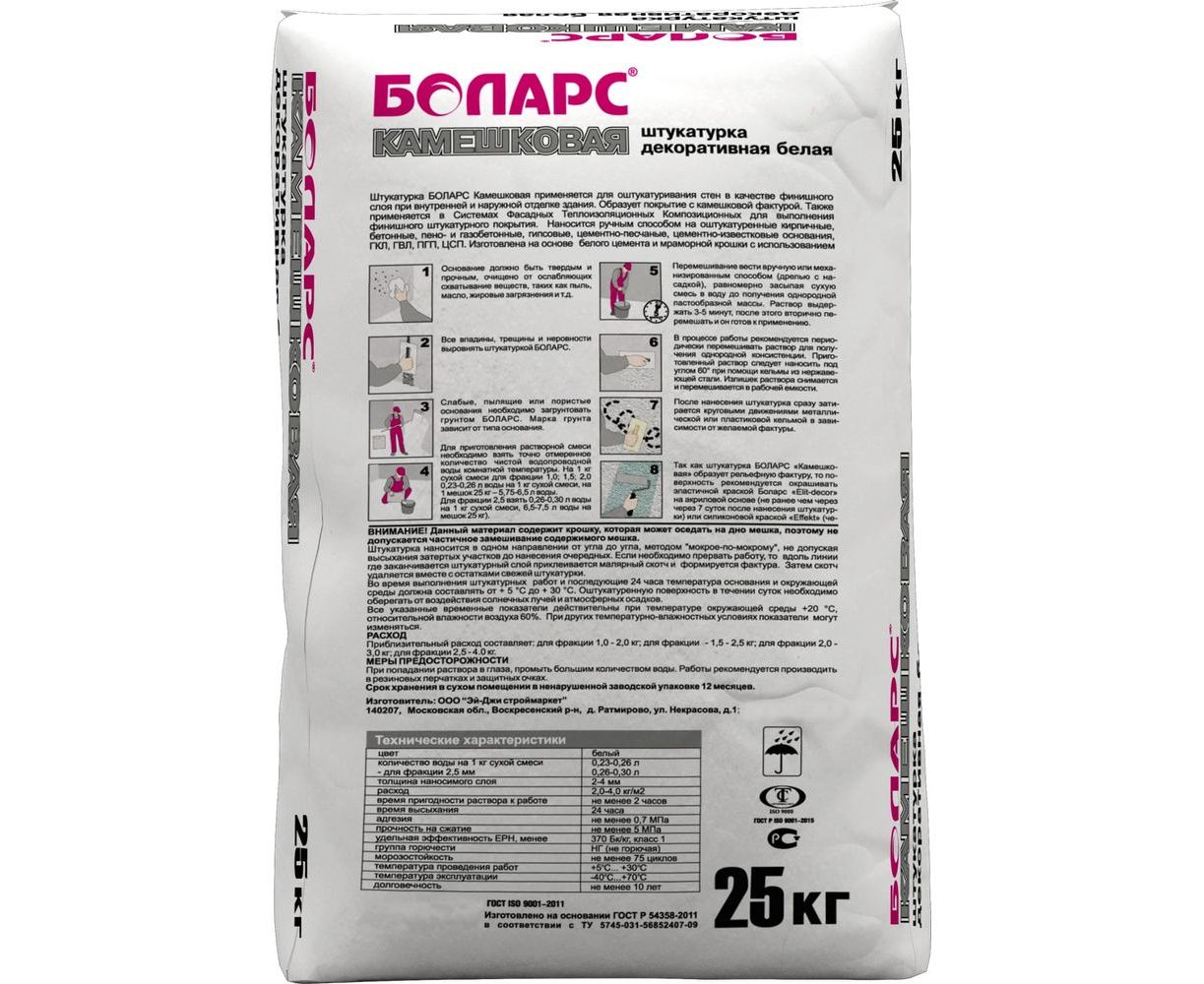 Декоративная штукатурка БОЛАРС Камешковая фракция 2 мм, 25 кг 00000006189 предназначена для ручного нанесения тонкослойного финишного штукатурного покрытия при отделке фасадов зданий и внутренних работах. Применяется в системах наружной теплоизоляции зданий. Имеет зернистую, "камешковую" структуру, может окрашиваться.
