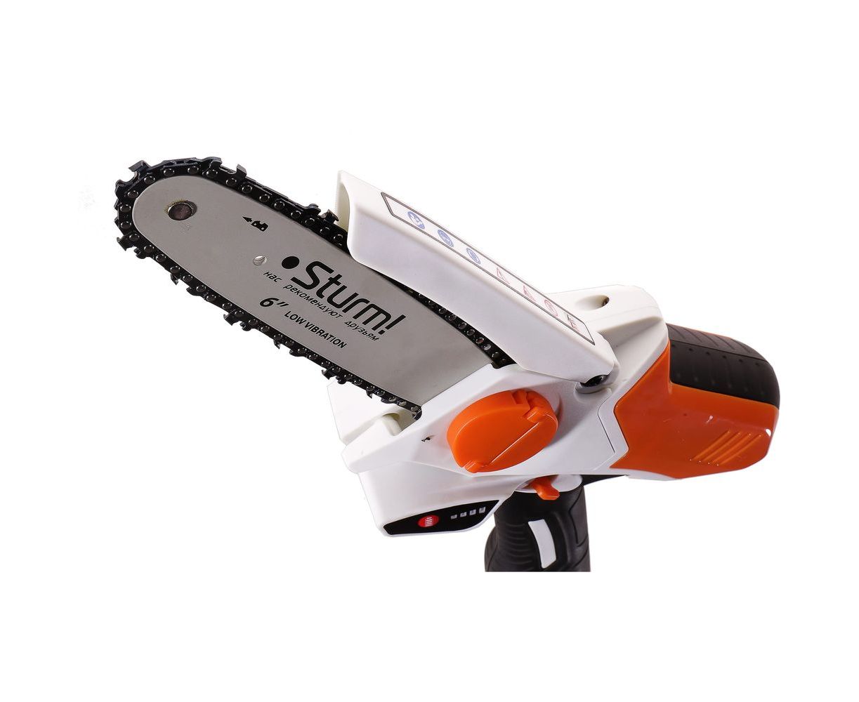 Аккумуляторная цепная пила Sturm CSC1804 прекрасно справится с обрезкой веток деревьев и простыми столярными работами.