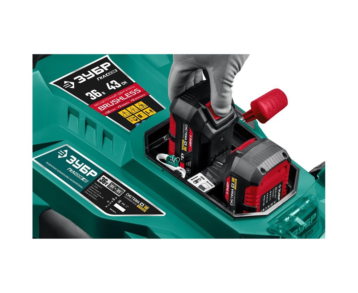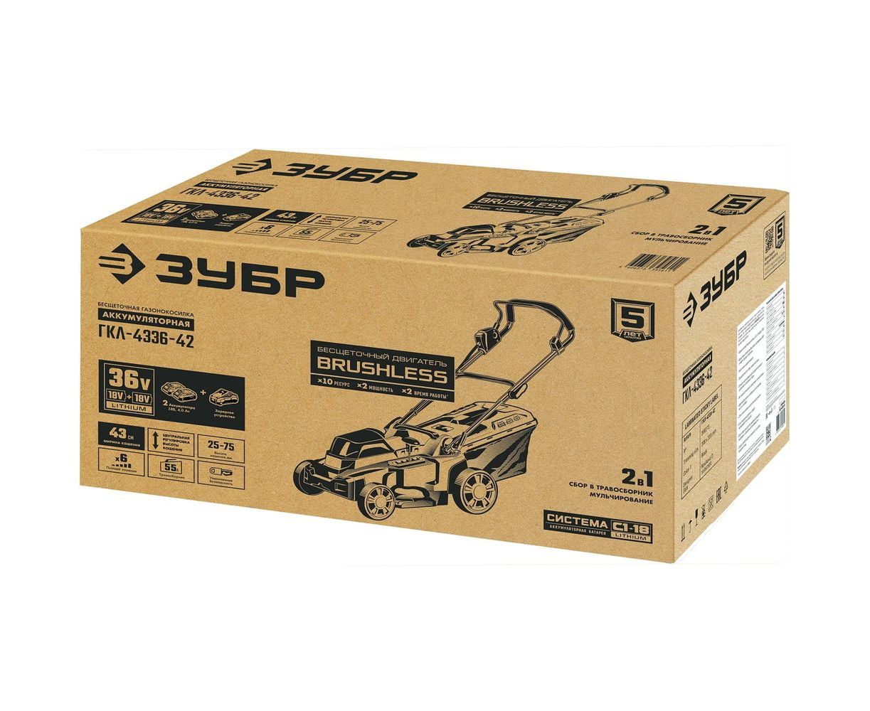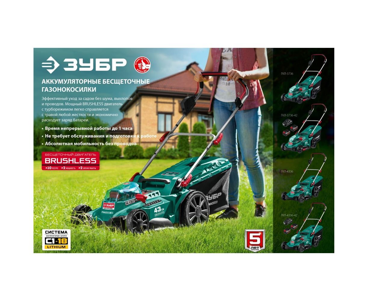 Бесщеточная газонокосилка ЗУБР 36 В, 4 А*ч, 2 АКБ и ЗУ ГКЛ-4336-42