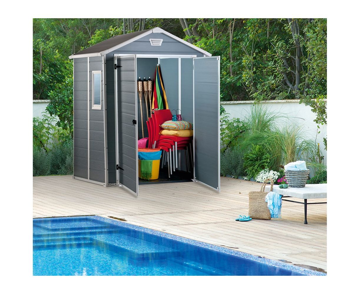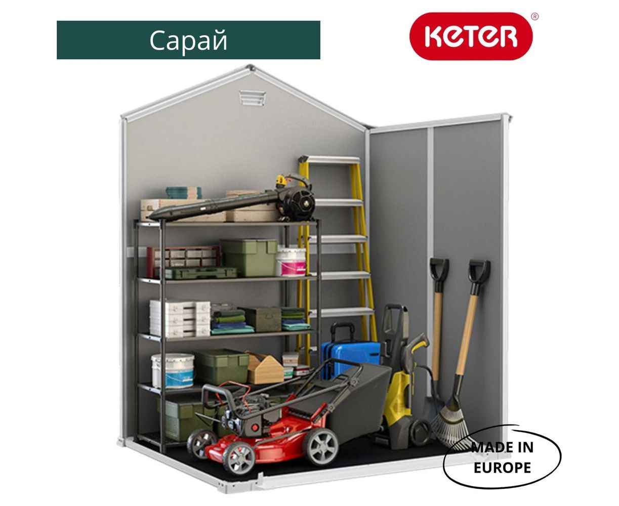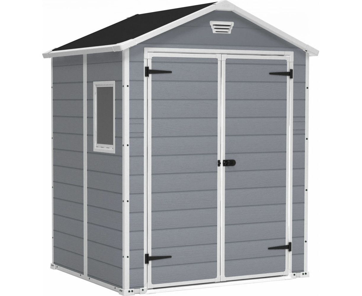 Хозяйственный блок Keter Manor 6x5 DD 228615 с двойными стенками предназначен для хранения мототехники, самокатов, велосипедов, лыж, садового инструмента и мебели, инвентаря для уборки.