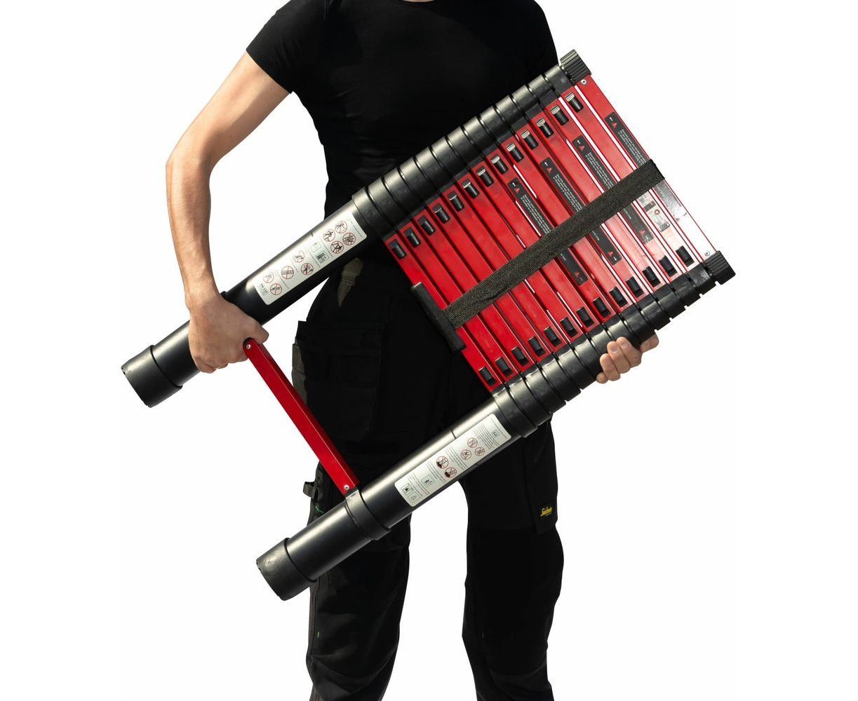 Она легко транспортируется, без проблем помещается даже в небольшой автомобиль. Лестница без усилий раскладывается и мало весит. Имеет 14 рифленых ступеней, которые гарантируют надёжное сцепление стопы с поверхностью. Шаг ступени: 35 см. Ступеньки в рабочем положении фиксируются автоматически. Система блокировки предохраняет от непроизвольного складывания лестницы, разблокировка осуществляется нажатием кнопок на ступенях.