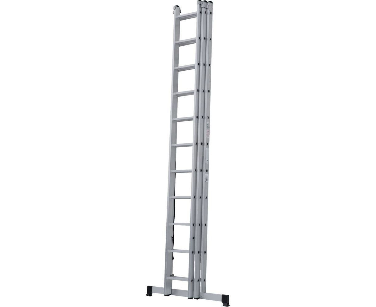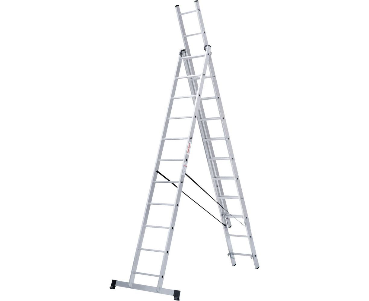 Трехсекционная лестница Новая Высота 3х11 ступеней 1230311 представляет собой три соединенные секции и в зависимости от их расположения используется как стремянка, стремянка с выдвинутой секцией, приставная односекционная, приставная выдвижная лестница.