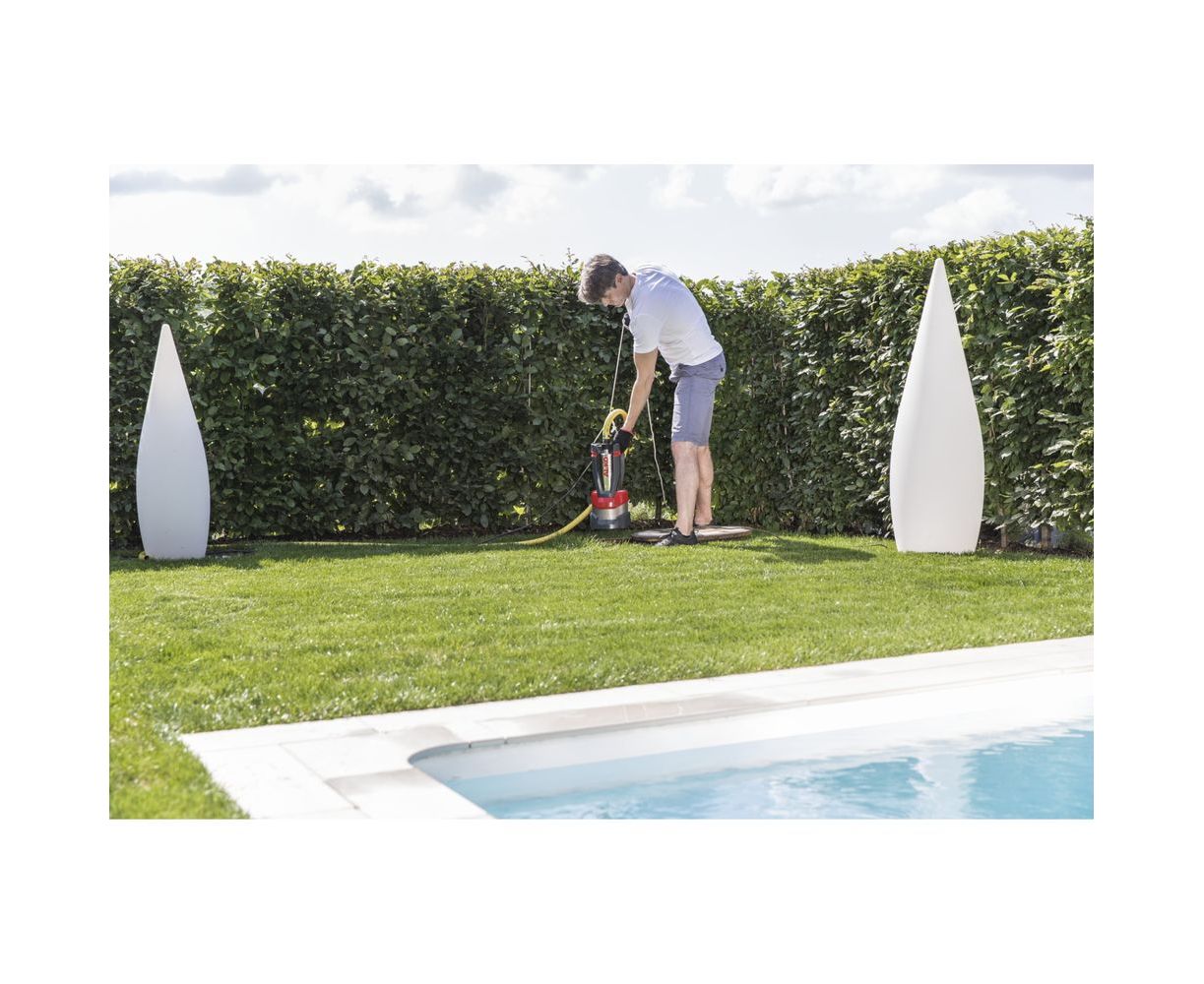 Благодаря мощному двигателю в 1000 Вт и 3-ступенчатому нагнетательному механизму достигается скорость потока до 6500 л/ч, а перекачивание воды выполняется в кратчайшие сроки. К выпускному отверстию насоса подсоединяется шланг диаметром 1.5 дюйма (47.8 мм). Подсоединение фланца для откачивания чистой воды из верхней части цистерны можно выполнить без специальных инструментов. Насос используется в положении лежа. Ручки специальной формы не дают насосу переворачиваться.