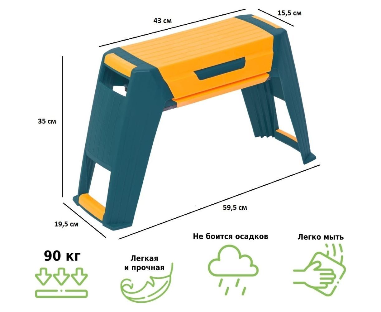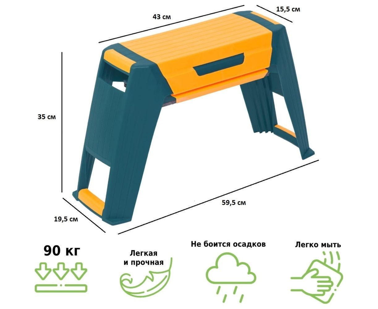 Нужно прополоть сорняки на огороде? Прорыхлить клумбу с любимыми цветами? Обрезать и подвязать куст пиона? Собрать урожай малины и смородины? Убрать… В саду и на даче всегда что-то нужно сделать и садовая скамейка перевертыш Helex 3 в 1 станет вашим надежным помощником и в работе, и в отдыхе. Эту дачную мебель удобно использовать как мобильный, легко переставляемый огородный стульчик или небольшую садовую лавочку. Также скамья пригодится пожилым людям как стул - табуретка в прихожую, для того, чтобы было удобнее снимать и одевать обувь. Легкая и прочная пластиковая садовая скамейка сделана из качественного полипропилена, устойчивого к перепадам температур и УФ-излучению. Поэтому ее можно использовать при работе в саду и на огороде и весной, и летом, и осенью. И эта уличная мебель прослужит вам долгие годы. В отличие от обычной складной металлической скамейки 2 в 1, скамейка перевертыш Helex 3 в 1 имеет не только две рабочие стороны (табурет для комфортной работы сидя и опора для работы на коленях) но и вместительный органайзер для садового инвентаря.