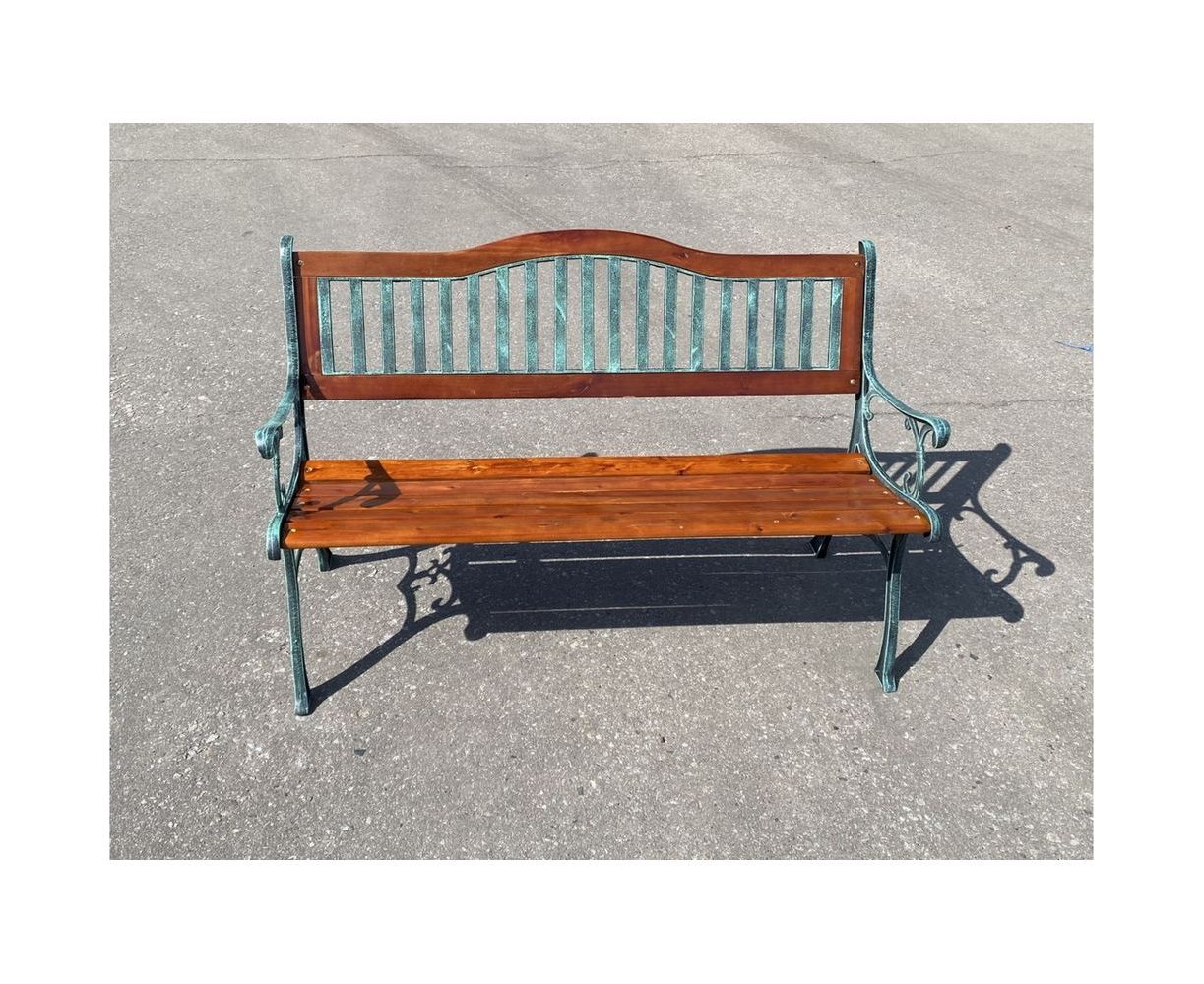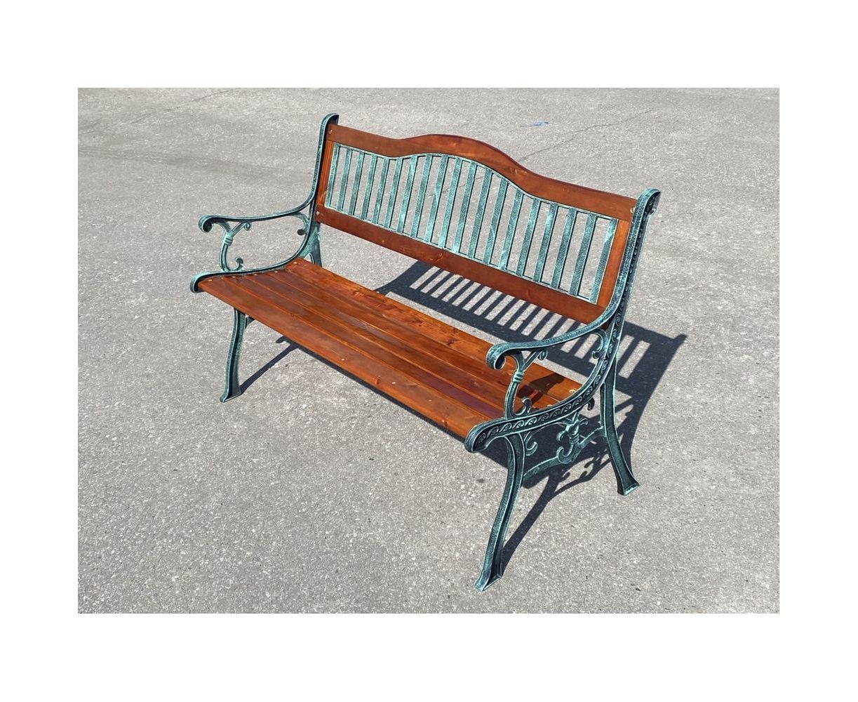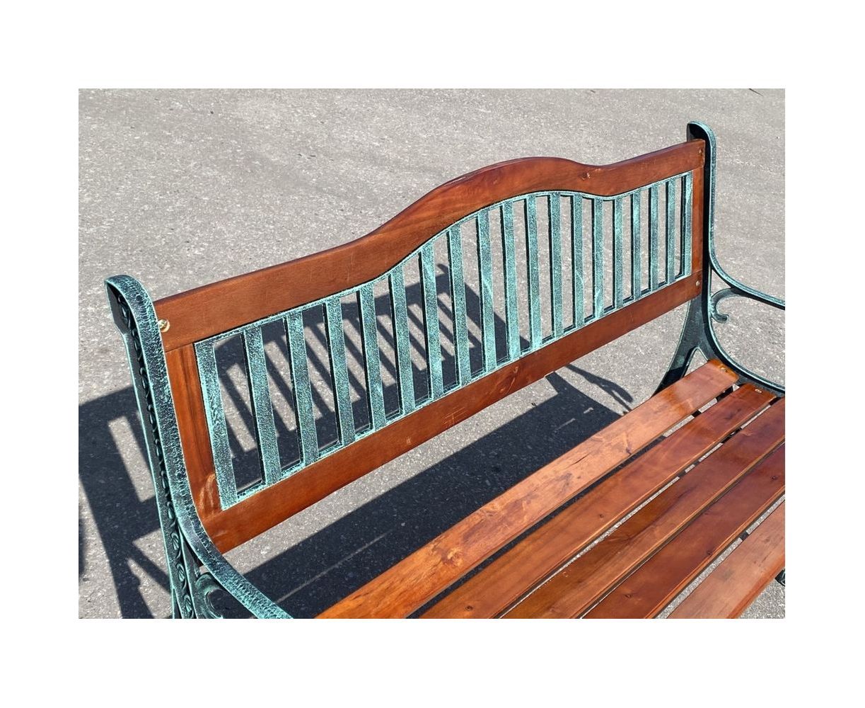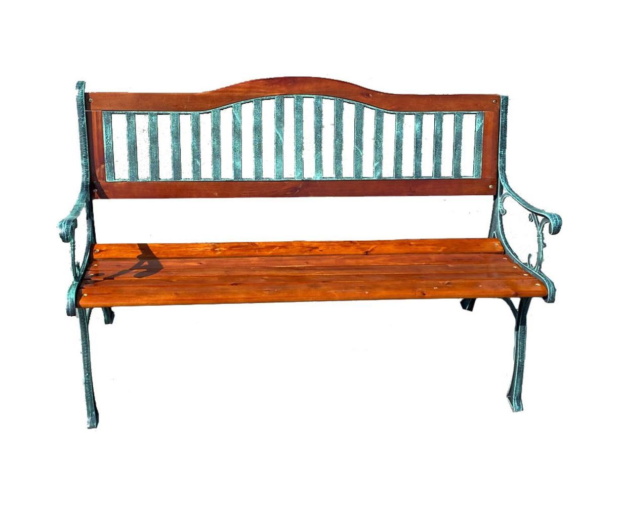 Садовая скамейка SevenBerg ритмика 1.3 м 4687202882571 изготовлена из чугунных боковин, покрашенных краской под зеленый антик, и дерева Кемпас из Юго-Восточной Азии, покрытого лаком.