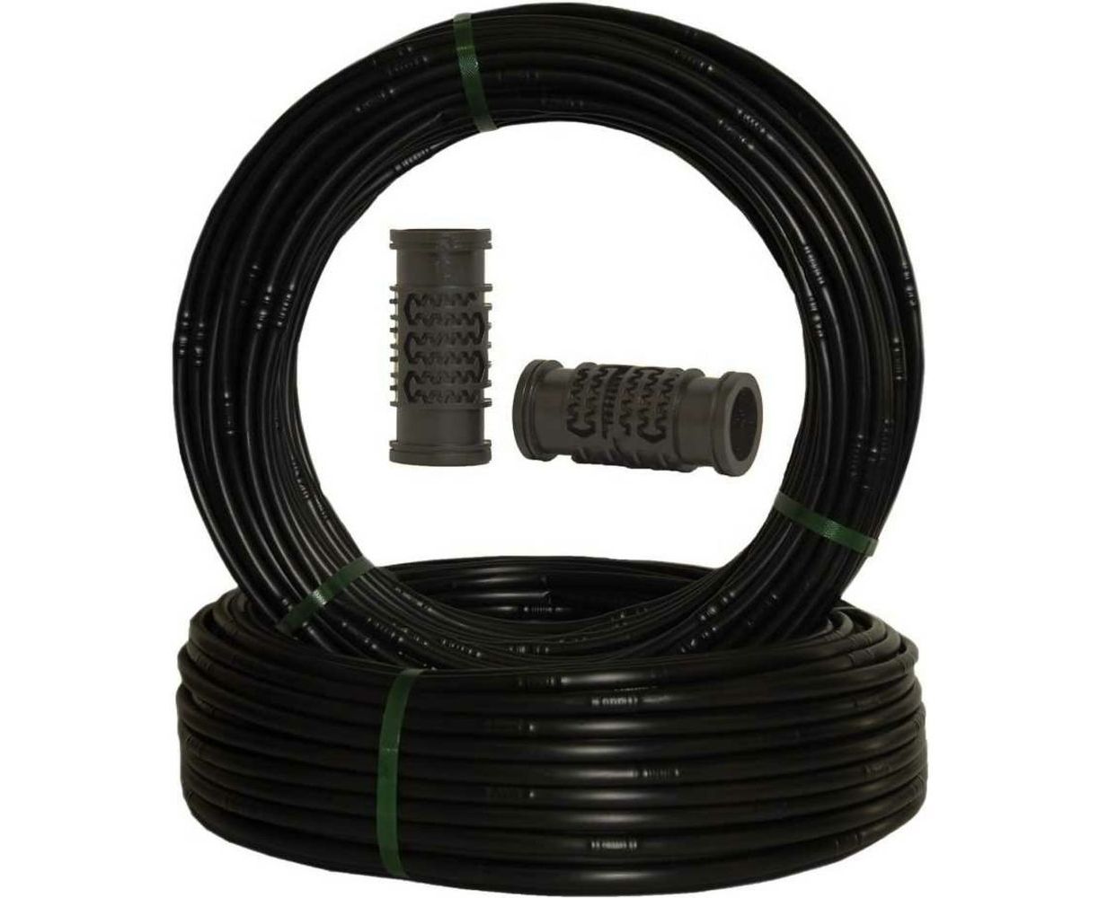 В трубку уже вмонтированы компенсированные эмиттеры (капельницы). Расстояние между эмиттерами 33 см. Расход воды одним эмиттером 2 л/ч. Работает от емкости или стандартного водопровода.