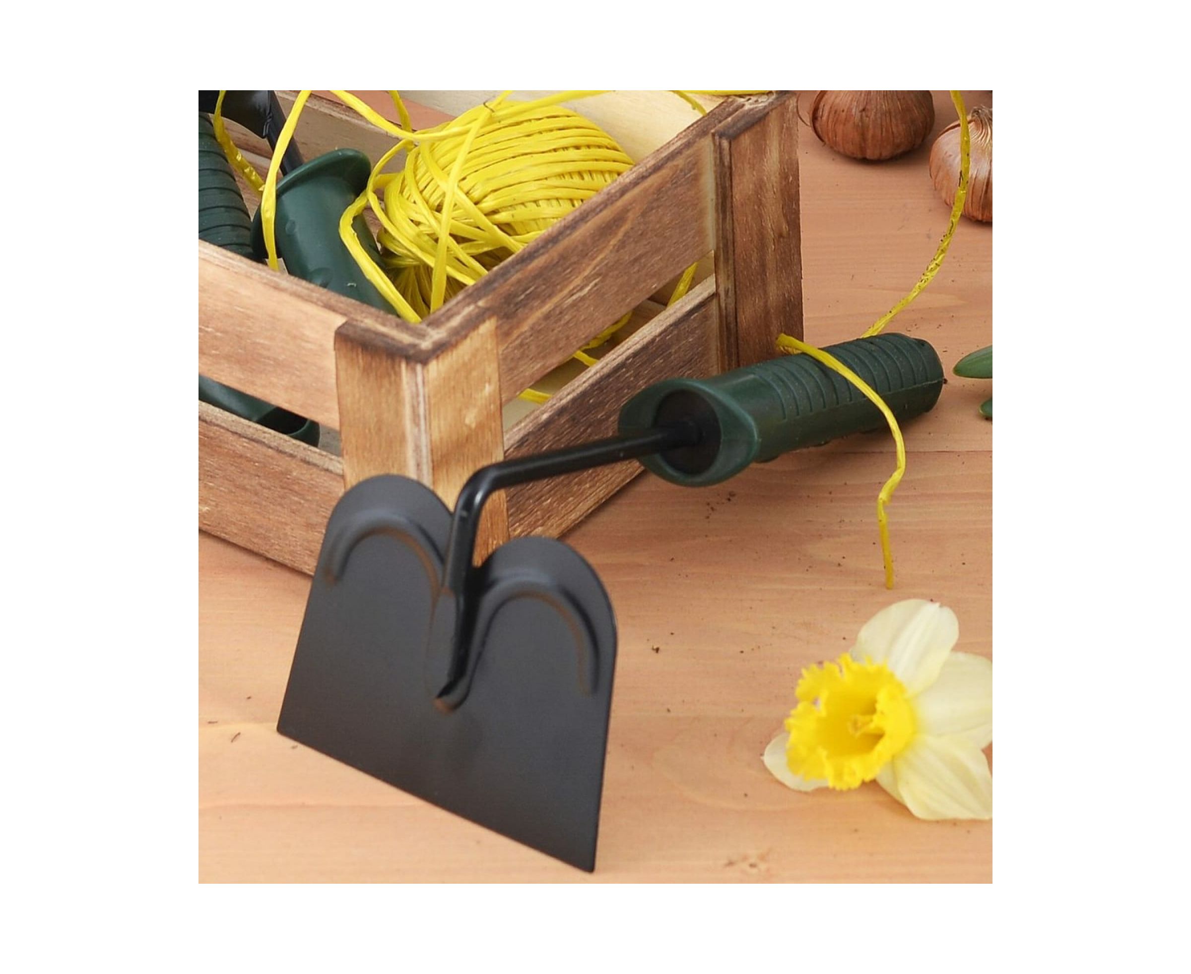 Помогает подготовить почву к посадке растений, измельчить комья земли, окучить растения, а также удалить сорняки.