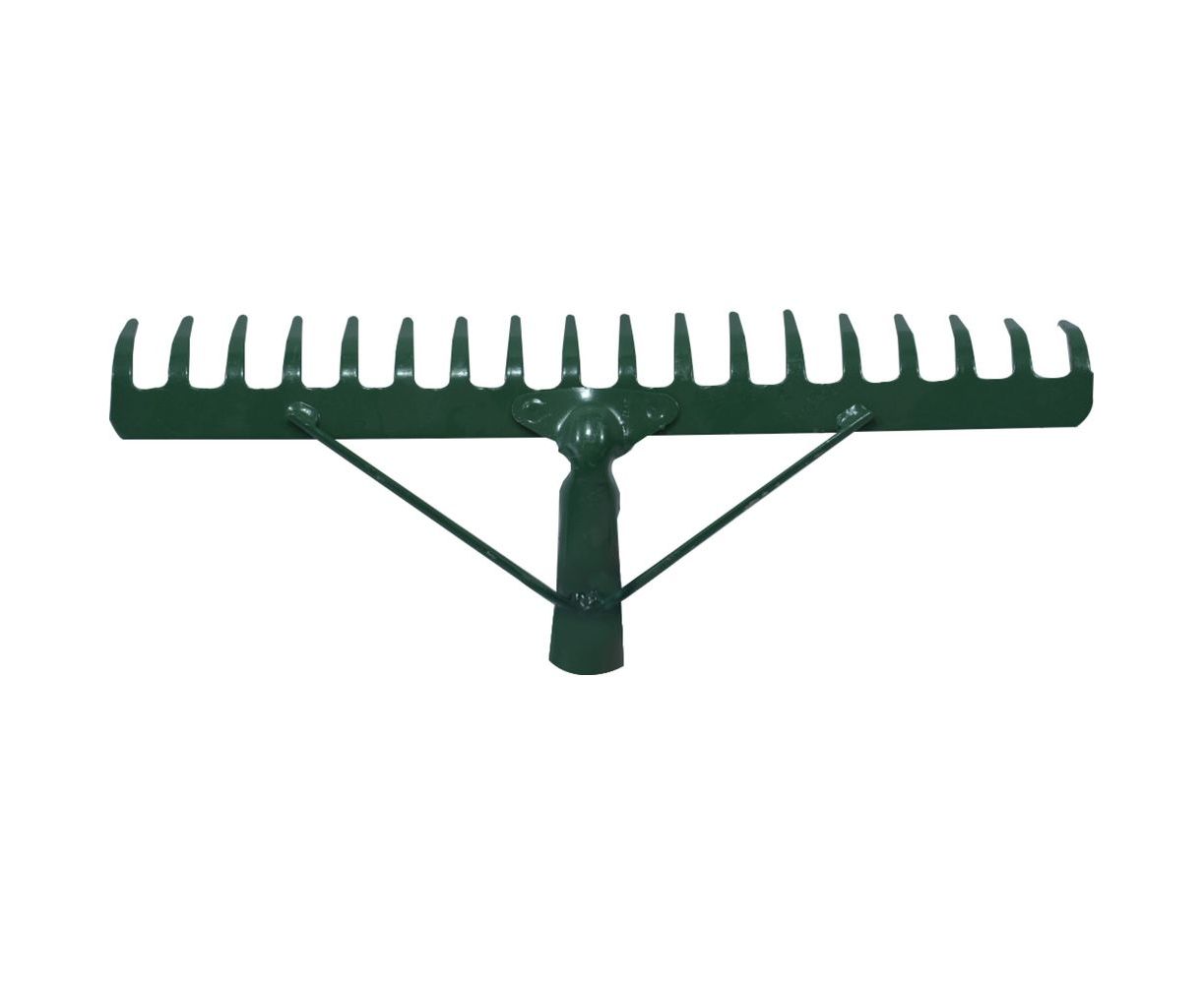 Дачные грабли имеют 18 зубцов и следующие размеры: ширина 48 см, высота зубца 7 см. Черенок не входит в комплект. Необходимо приобрести дополнительно, диаметр черенка 28-30 мм.