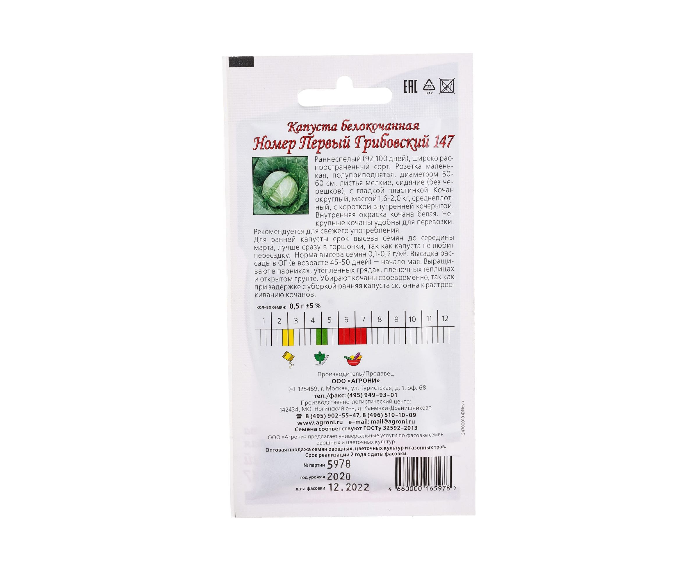 Семена Агрони Капуста белокочанная НОМЕР ПЕРВЫЙ ГРИБОВСКИЙ 147 5978