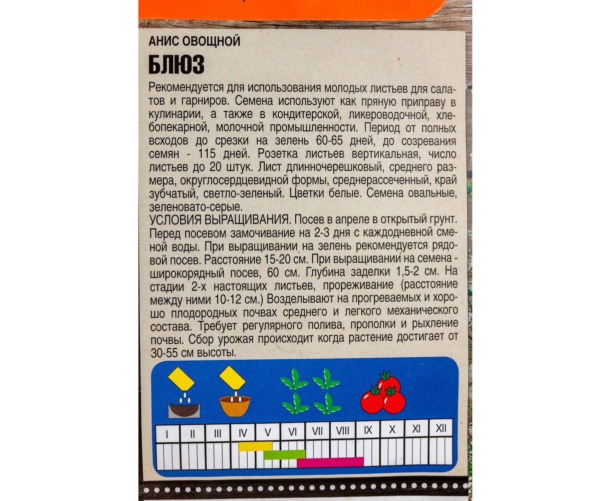 Семена Тимирязевский питомник анис овощной Блюз 0.3 г 4630035661806 ценится как приправа для гарниров и салатов, добавляется при выпечке хлеба и булочек. Когда растение достигает высоты 30-55 см, можно собирать урожай. Пряный запах способен отпугивать насекомых, а сам анис обладает лечебными свойствами.