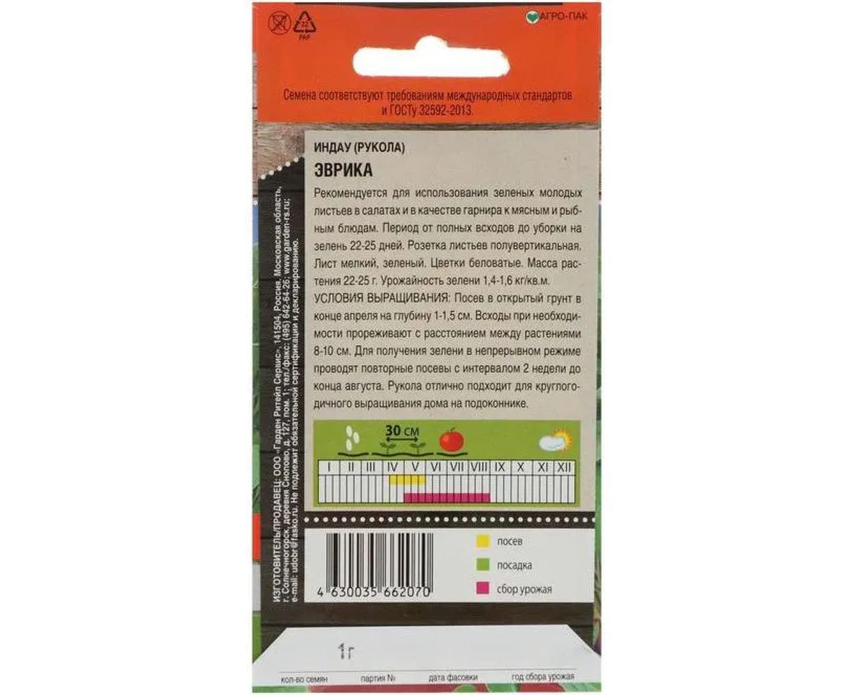 Семена Тимирязевский Питомник салат индау (рукола) Эврика 1 г Of000132231 применяются для выращивания в открытом грунте и под пленочными укрытиями.