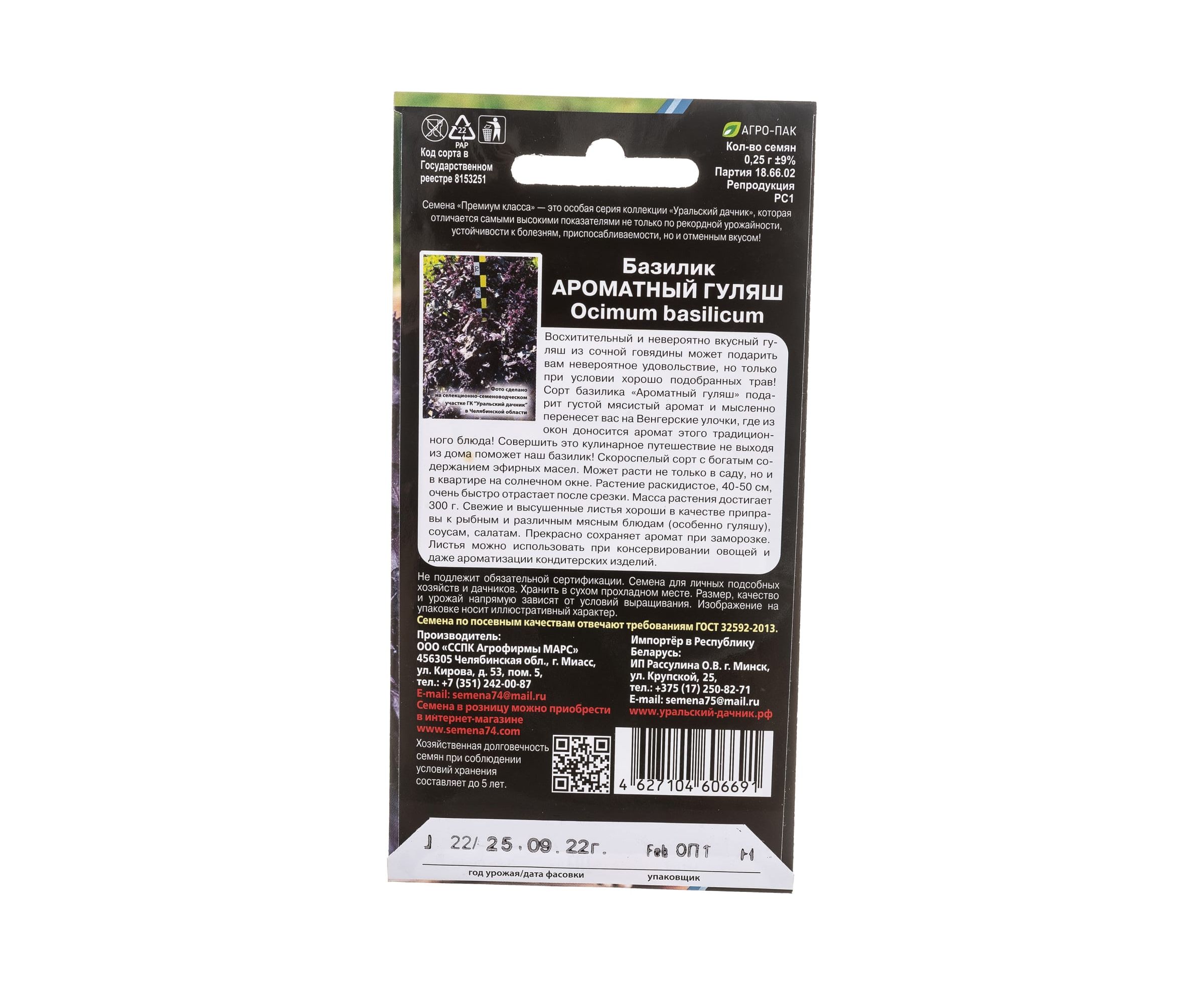 Семена Уральский дачник базилик Ароматный Гуляш 0.25 г 4627104606691 - скороспелый сорт с богатым содержанием эфирных масел. Может расти не только в саду, но и в квартире на солнечном окне. Растение раскидистое, 40-50 см, очень быстро отрастает после срезки. Масса растения достигает 300 г. Прекрасно сохраняет аромат при заморозке.